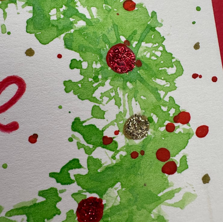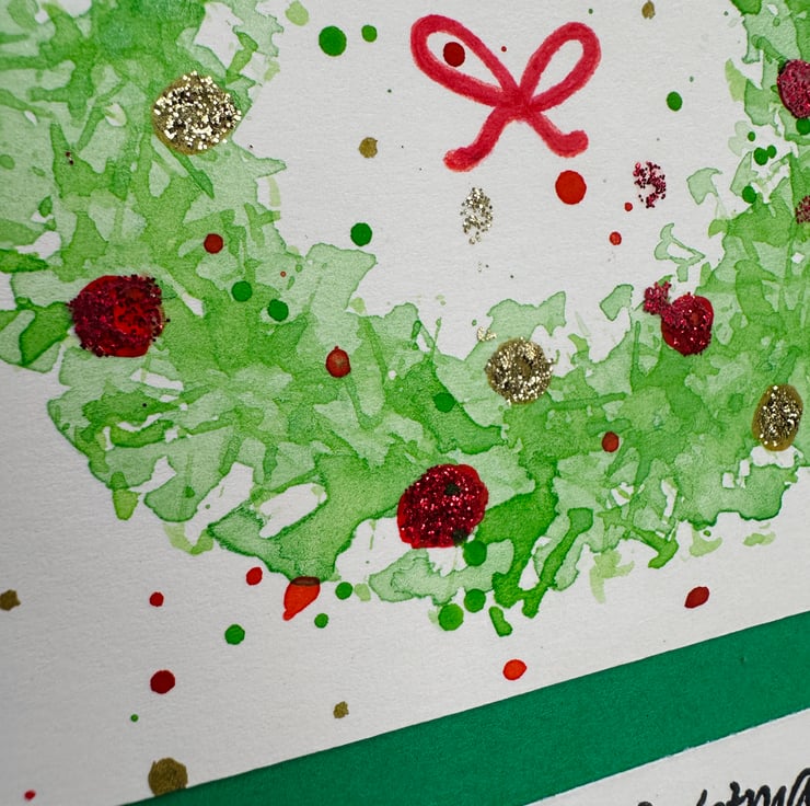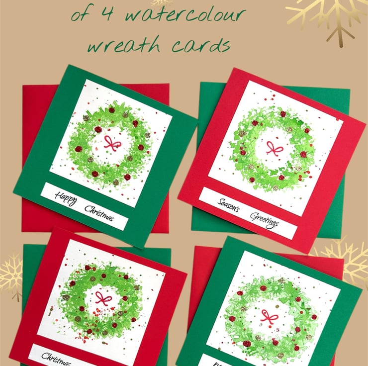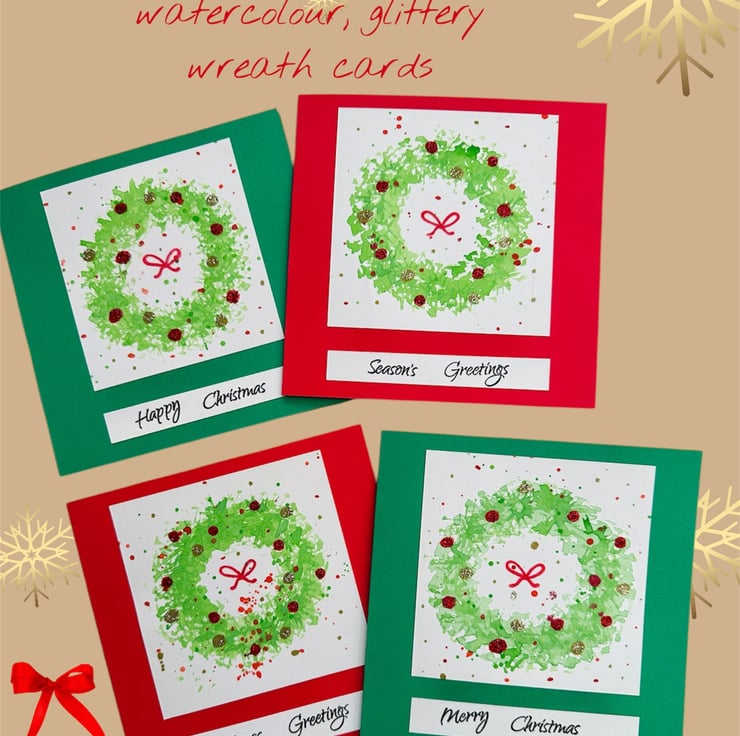 Hand painted in watercolours, this set of 4 cards each depict a unique wreath with red and gold baubles with a sparkly overlay of glitters and a splash of colour.
