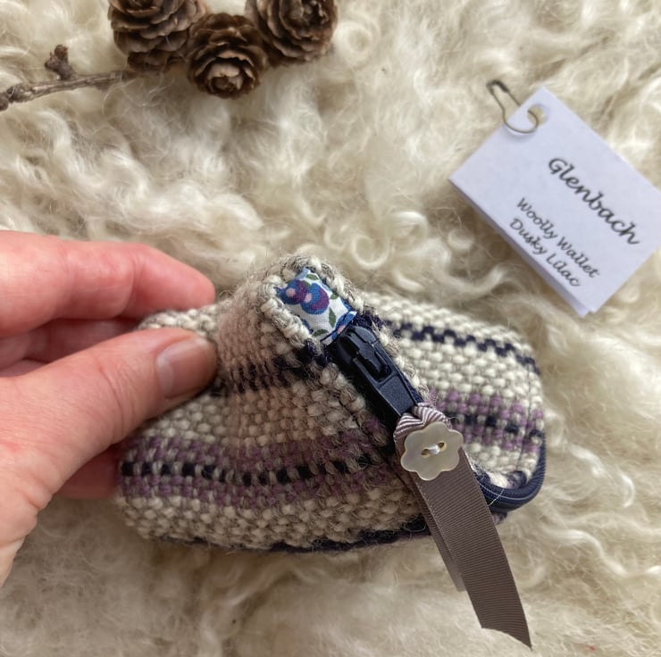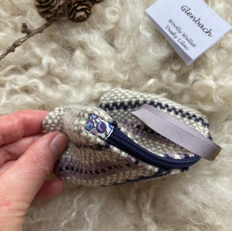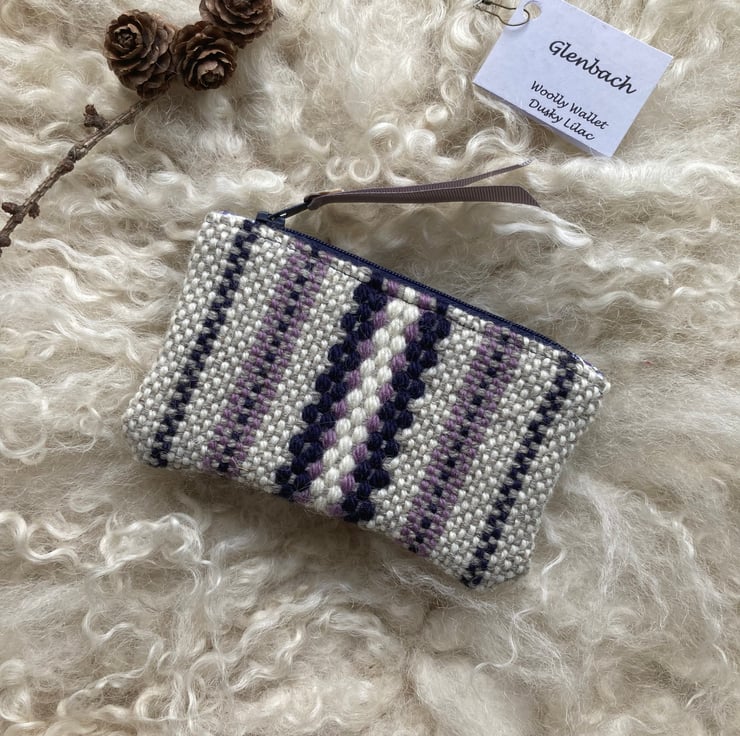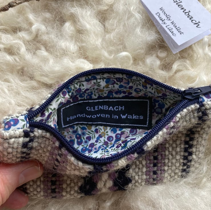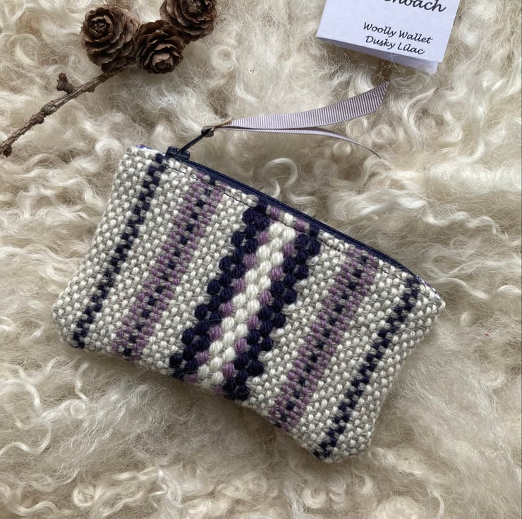 Our Woolly Wallet is handwoven using natural shades of grey and ecru wool with a contrast of dusky lilac and navy blue - all British wool.