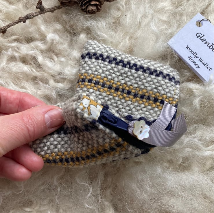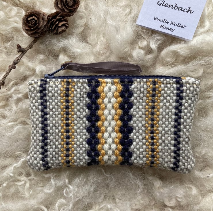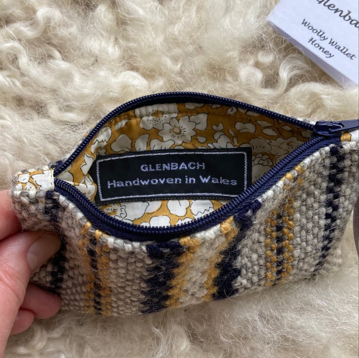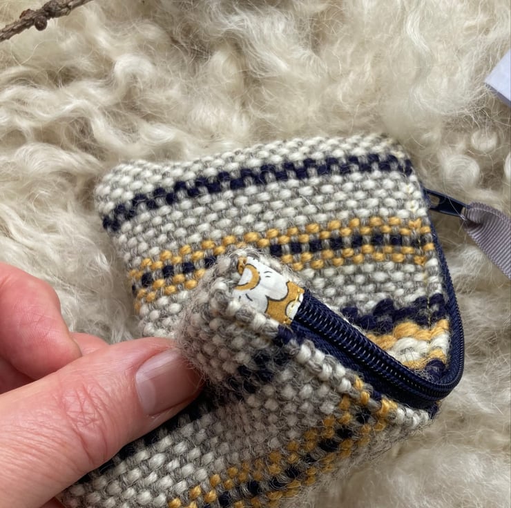 Our Woolly Wallet is handwoven using natural shades of grey and ecru wool with a contrast of honey yellow and navy blue - all British wool.