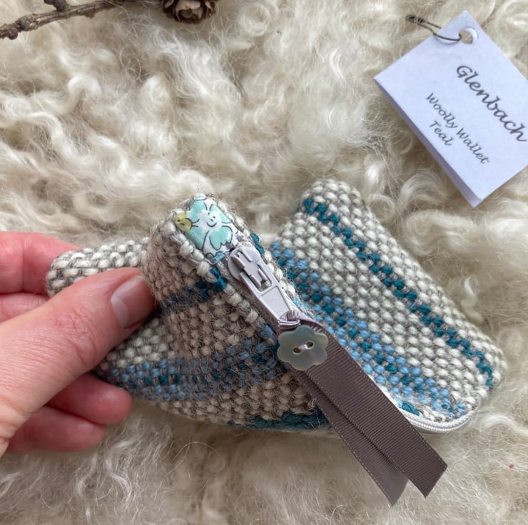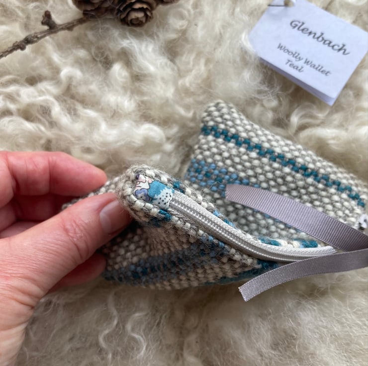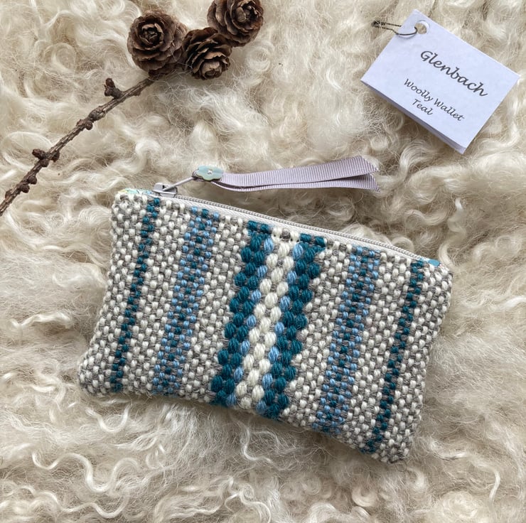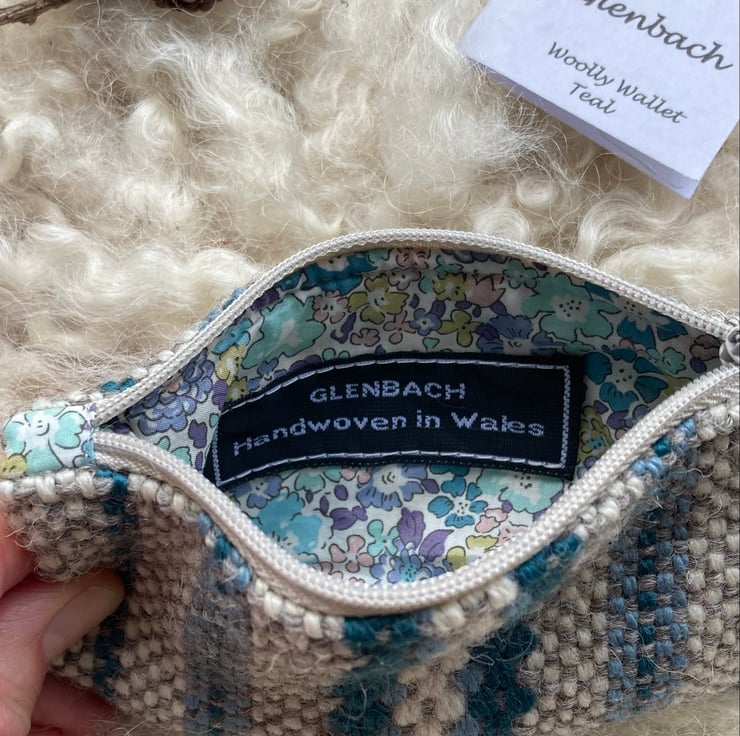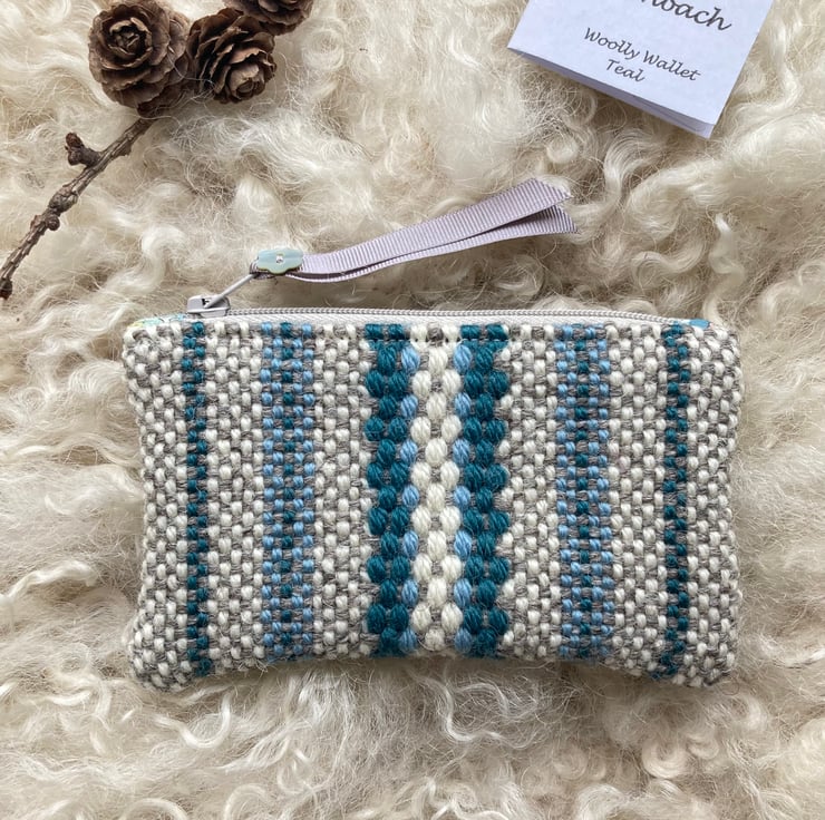 Our Woolly Wallet is handwoven using natural shades of grey and ecru wool with a contrast of teal and blue - all British wool.