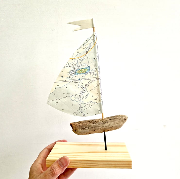 Driftwood sailboat with authentic nautical map sail, from Ship to Shore on Folksy. Other areas are available. The perfect gift for sailors, beachcombers and anyone who loves the sea (or maps!).