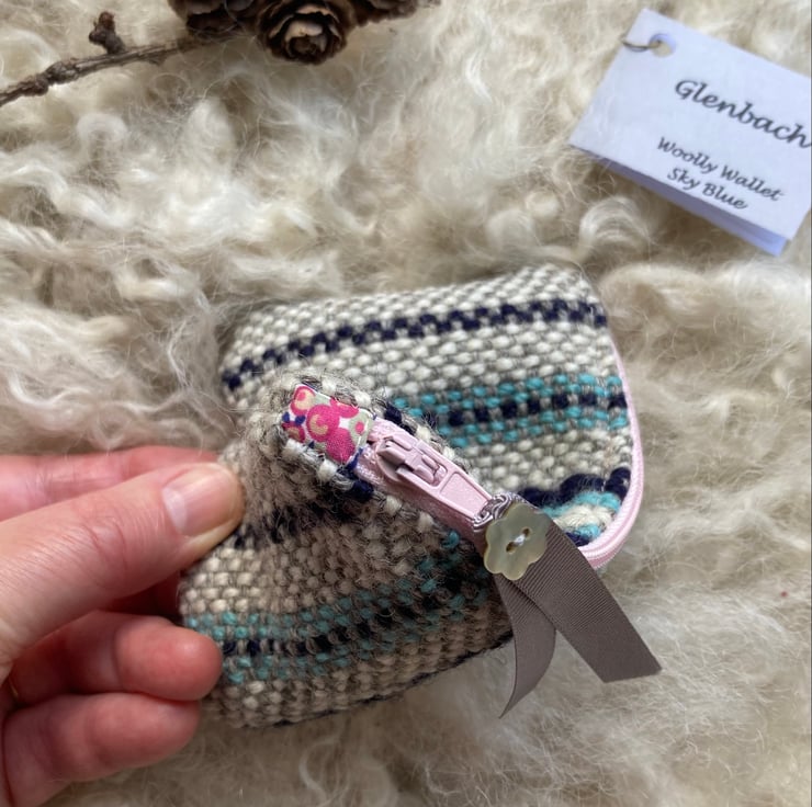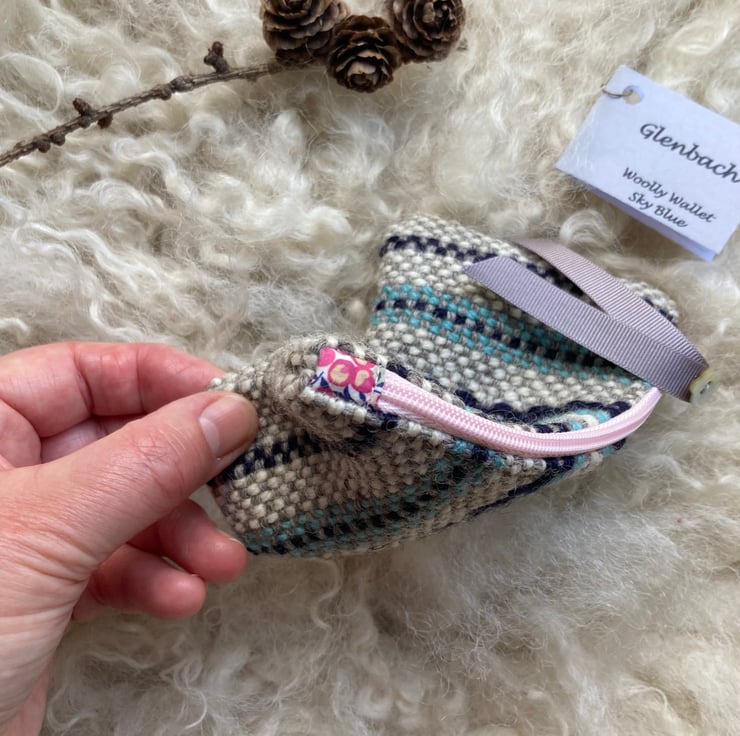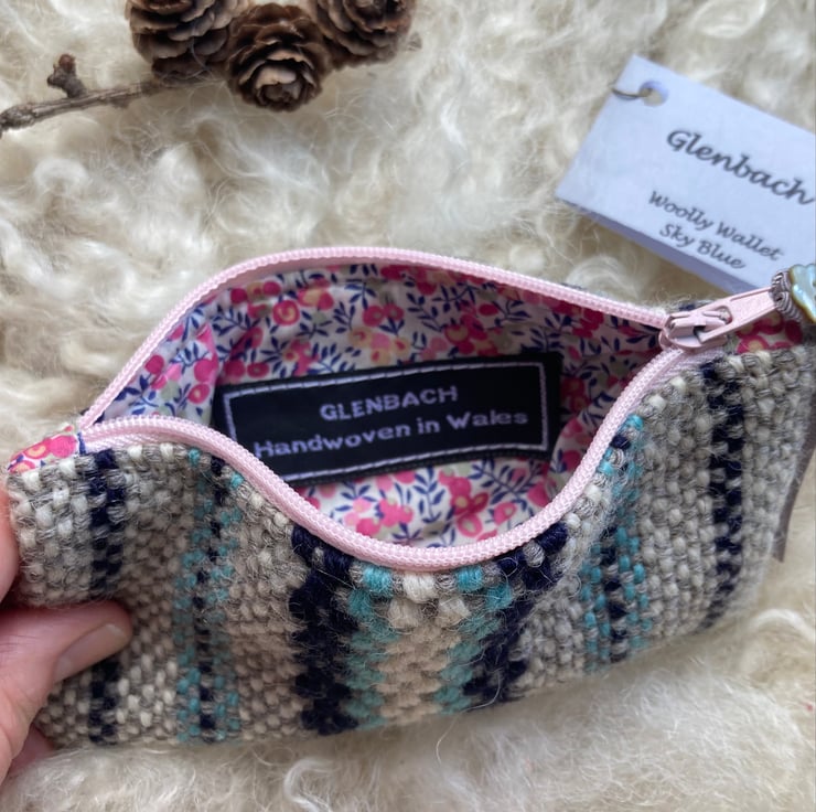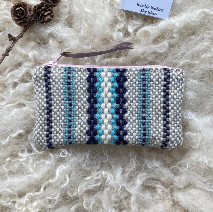 Our Woolly Wallet is handwoven using natural shades of grey and ecru wool with a contrast of sky blue and navy blue - all British wool.
