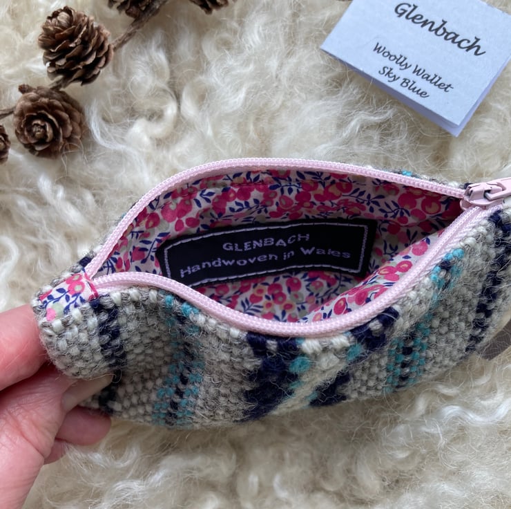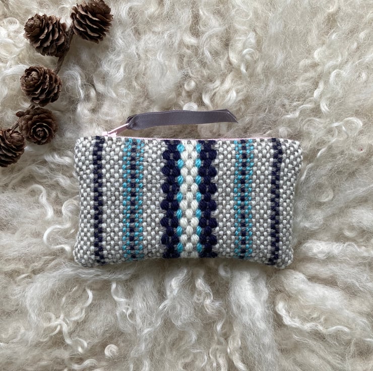 Our Woolly Wallet is handwoven using natural shades of grey and ecru wool with a contrast of sky blue and navy blue - all British wool.