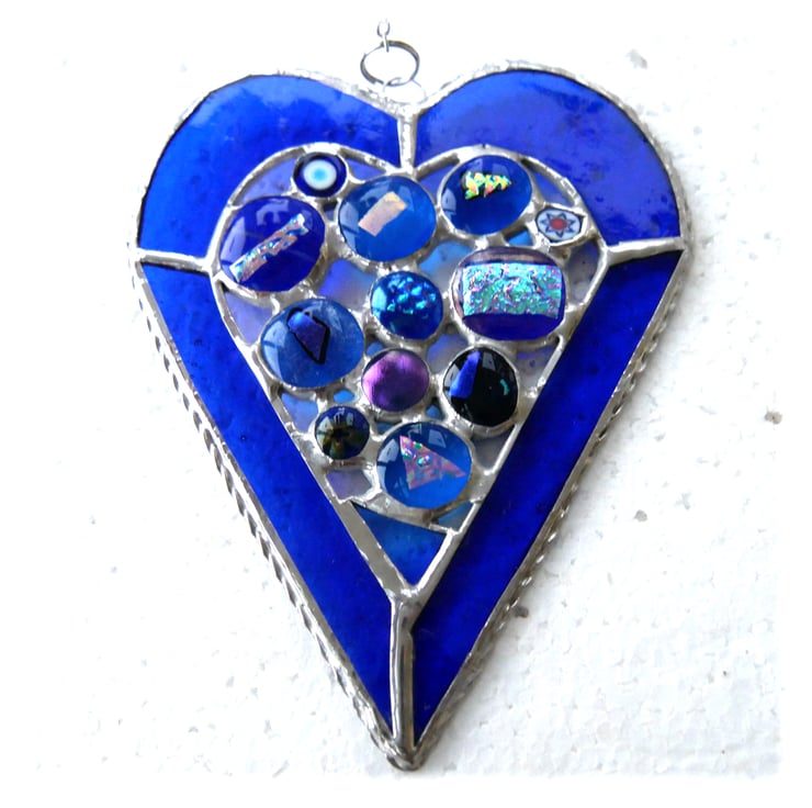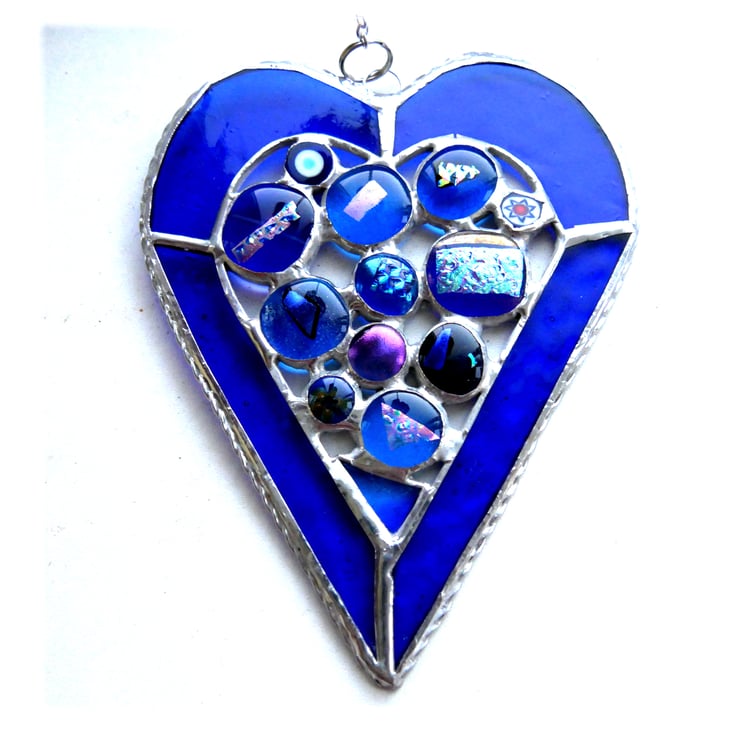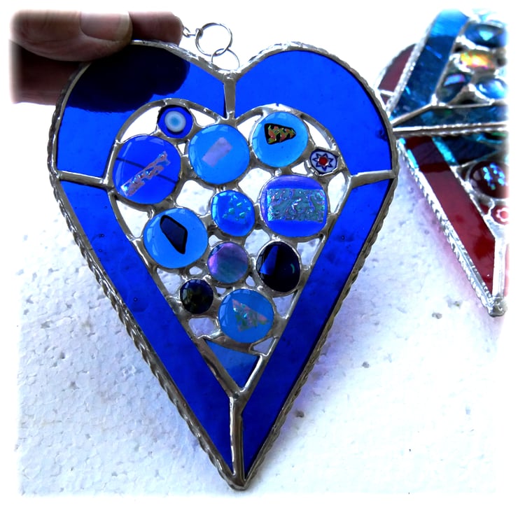 It is 14cm x 11cm and the heart border is cut from two types of bright blue glass, which is strengthened round the edge with twisted wire..