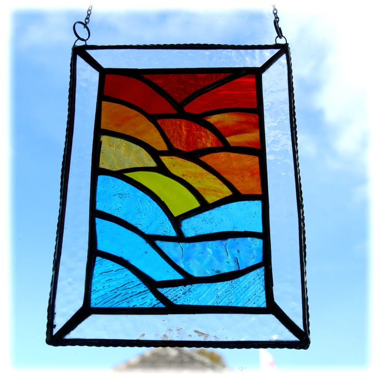 Using some rather gorgeous new types of glass, just arrived, I have formed ripples of sea at the bottom and of sunset clouds above with a yellow sun in the middle..
