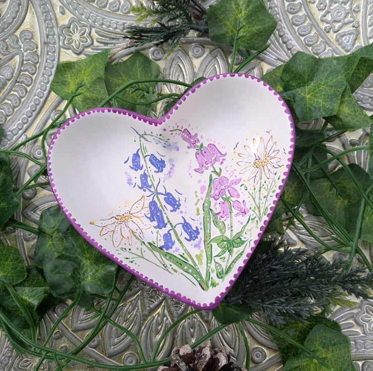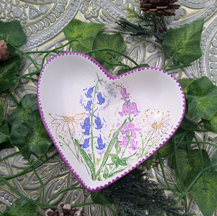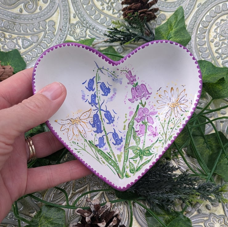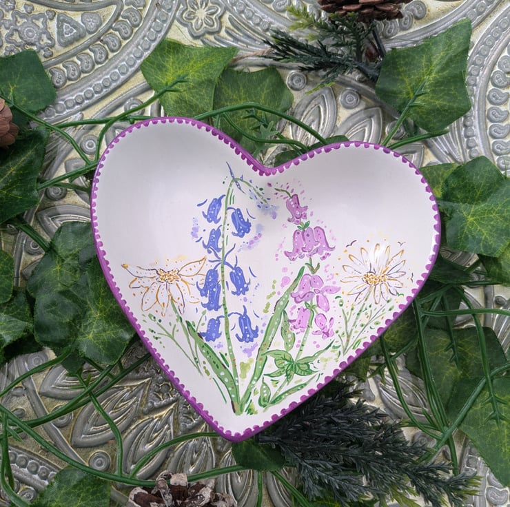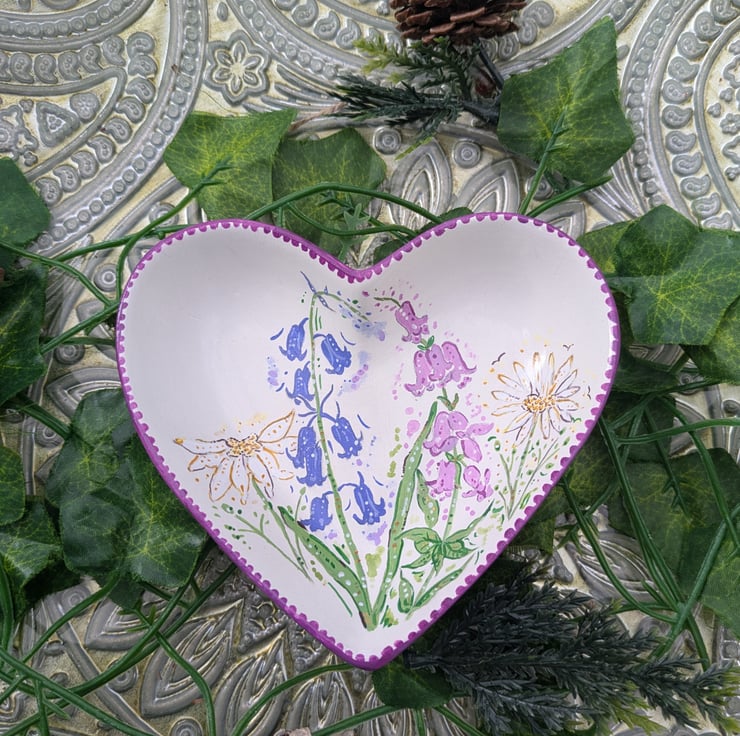 A beautiful hand-painted Wildflower heart decorative ring/ jewellery dish. Each dish has been lovingly hand-painted in acrylic and sealed with a gloss varnish. The size of the trinket dish 12.2 x 11 x 3 cm