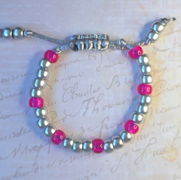 Simple yet striking, this bracelet combines metallic silver beads on a silver satin cord, with seven bright translucent pink beads placed evenly throughout for a vibrant pop of colour.