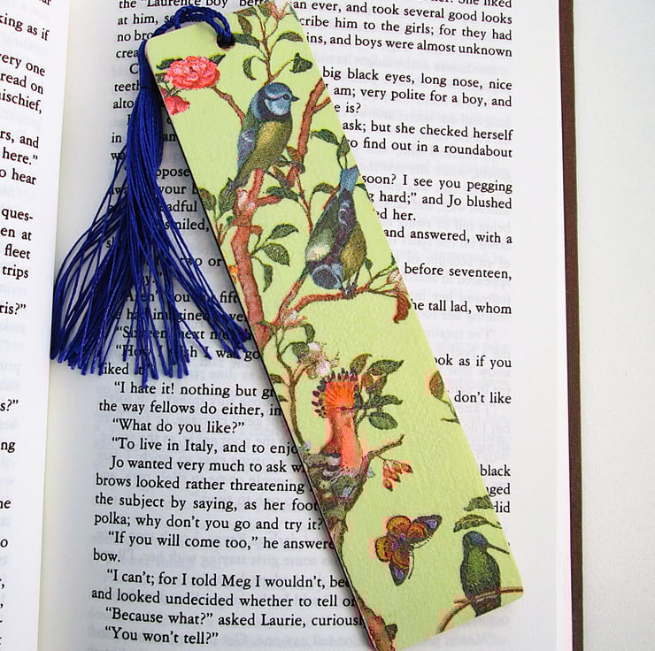 Blue tits and birds wood decoupage bookmark with tassel