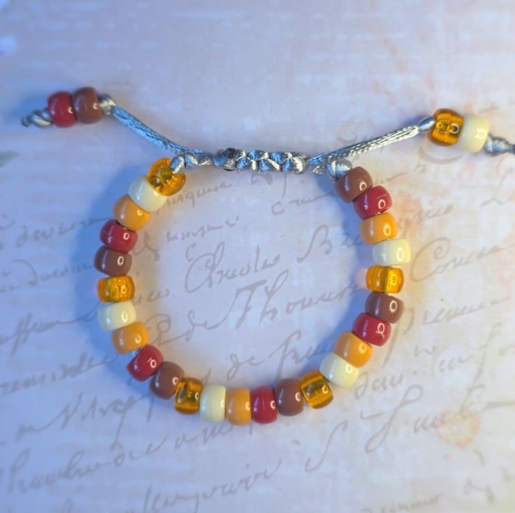 Inspired by the colours of autumn, this bracelet features a repeating pattern of three shades of brown, soft cream, and transparent orange beads, strung on a silver satin cord.