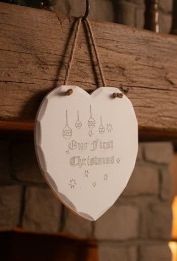 Heart shaped laser cut wall hanging. Etched with baubles and stars. Features the words "Our First Christmas". Twine hanger. Perfect gift for newlyweds.