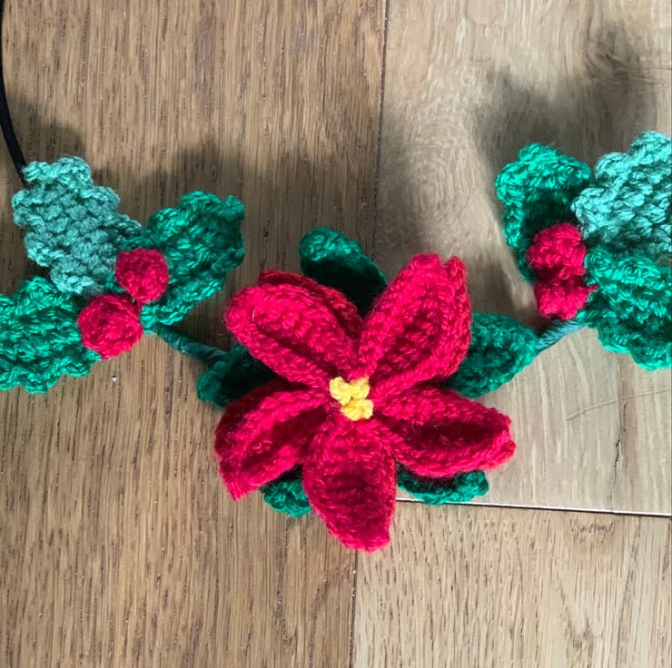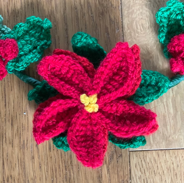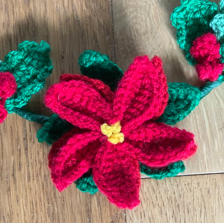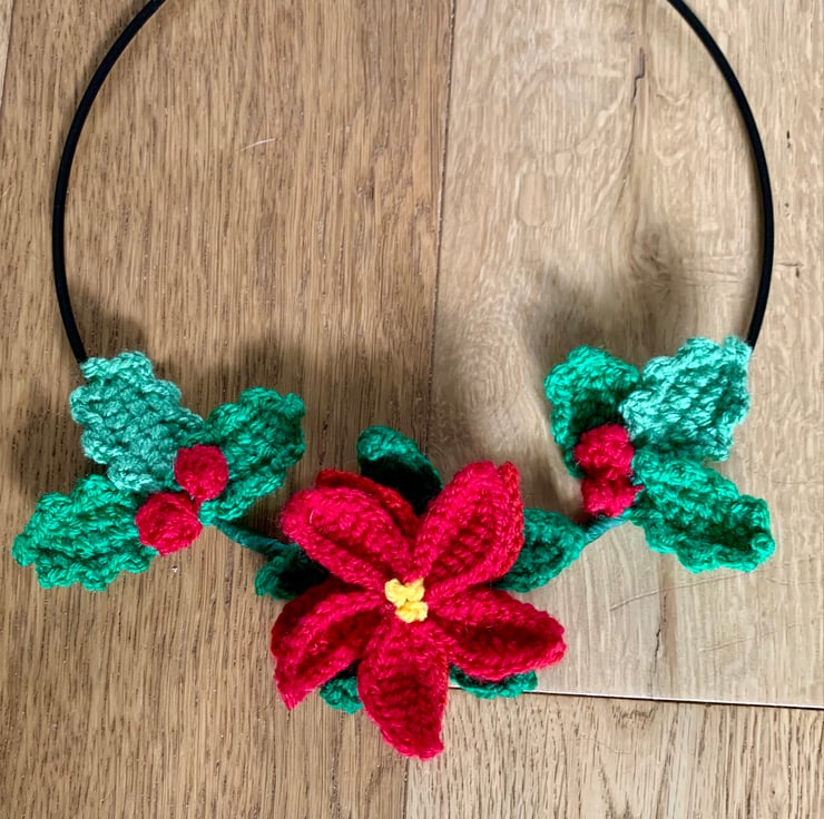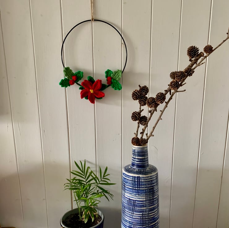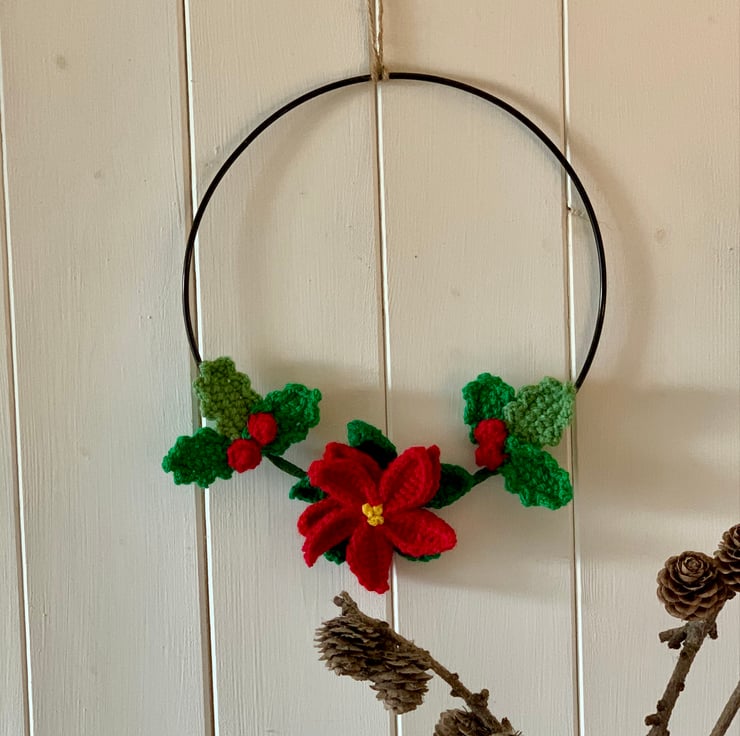 This small Christmas wreath consists of handmade crochet poinsettia and holly attached to a wire wreath ring. These traditional Christmas flowers will add an elegant festive touch to an internal door, mantle, dresser or set of drawers.