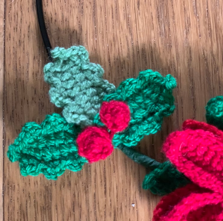 Crocheted in acrylic yarn the poinsettia and holly are attached to the wreath ring with florist wire and tape and secured with hot glue.