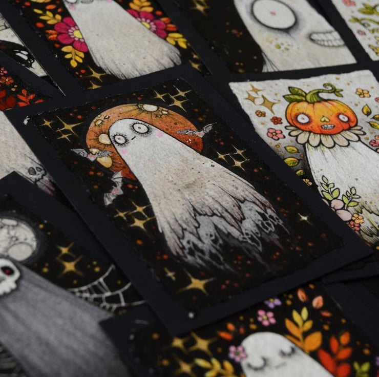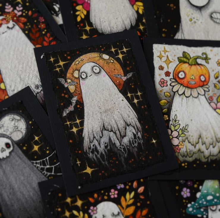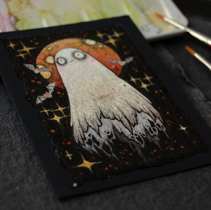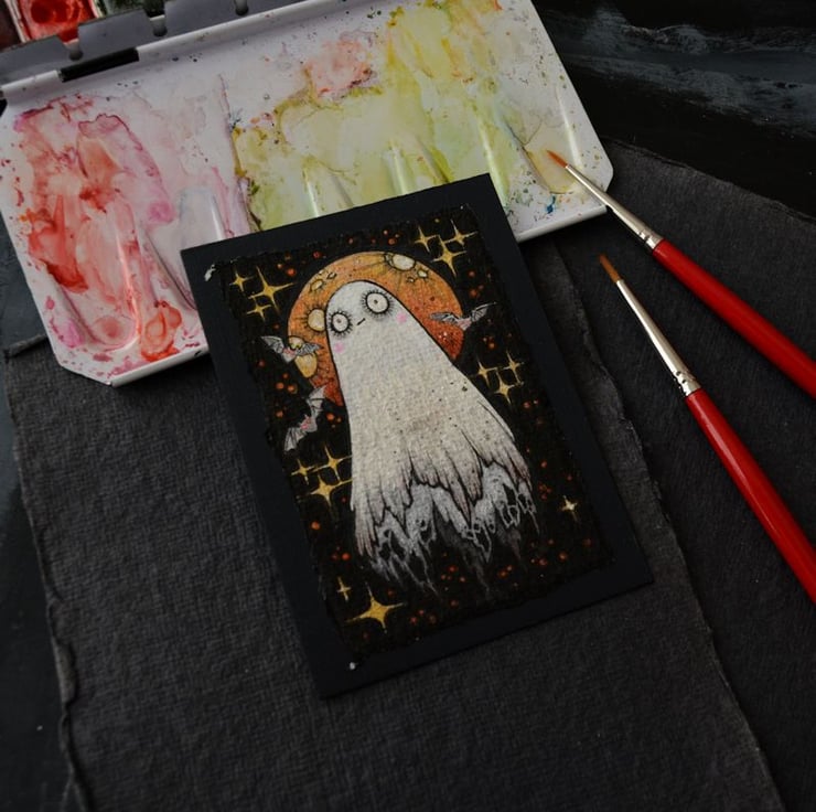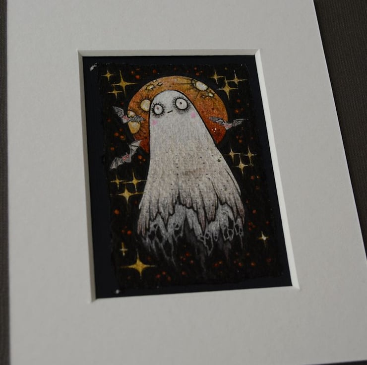 this aceo is an original artwork, hand drawn with a tiny 0.05 nibbed pen, then coloured with ink, artists pens and watercolour paints, on indian khadi paper. khadi paper is handmade from recycled cotton rag, it has a lovely textured surface and deckled edges. i have then mounted the illustration onto 300gsm cardstock, hand painted with a paynes grey to create a dark surrounding edge/background.