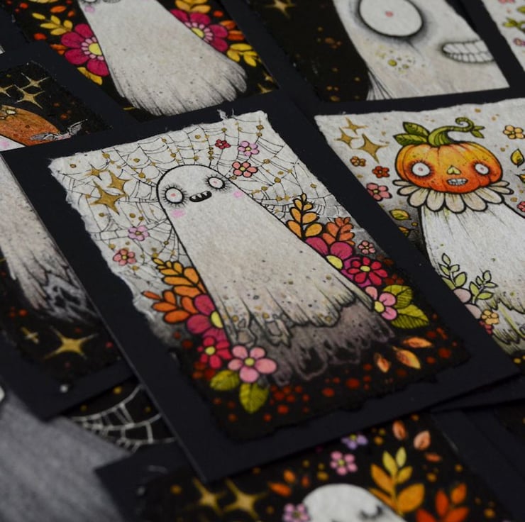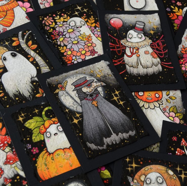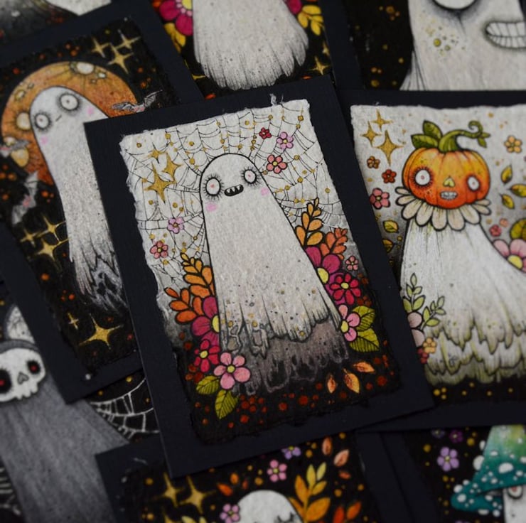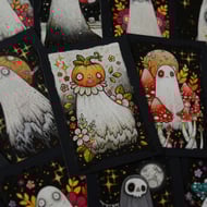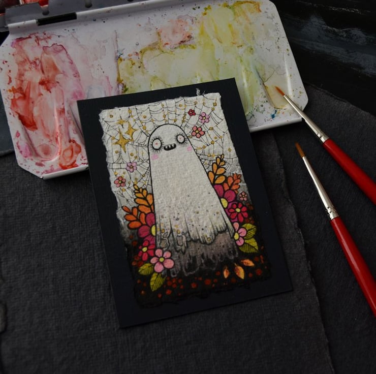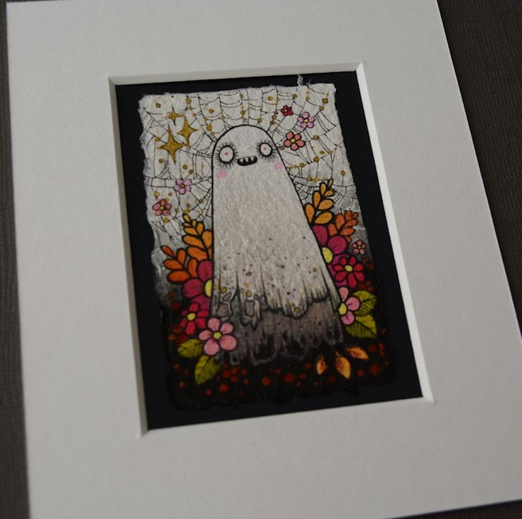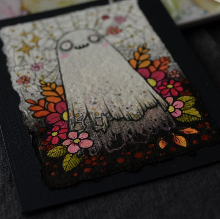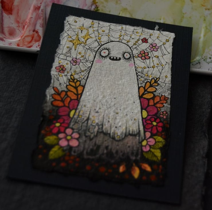 this aceo is an original artwork, hand drawn with a tiny 0.05 nibbed pen, then coloured with ink, artists pens and watercolour paints, on indian khadi paper. khadi paper is handmade from recycled cotton rag, it has a lovely textured surface and deckled edges. i have then mounted the illustration onto 300gsm cardstock, hand painted with a paynes grey to create a dark surrounding edge/background.