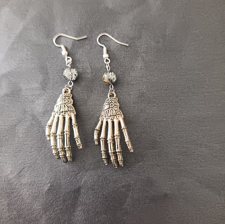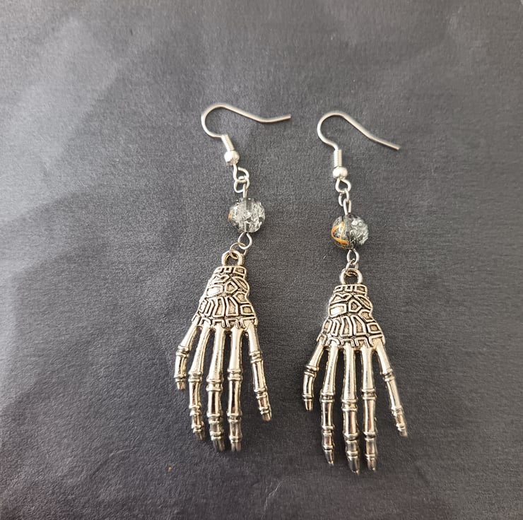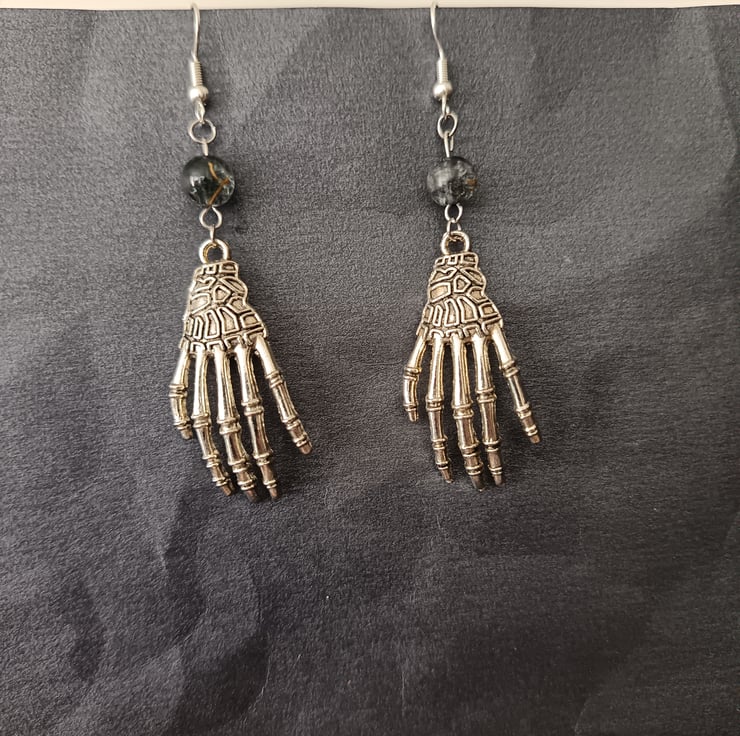 These handmade earrings are crafted with stainless steel hooks and sterling silver skeleton hands charms, with charcoal grey beads streaked with a little gold. They are unusual and eye-catching, in true gothic, spooky style.