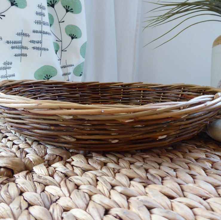 A round shallow sided basket. That can be used for bread, fruit, small storage, or interior decoration bringing a natural feel to your home.
