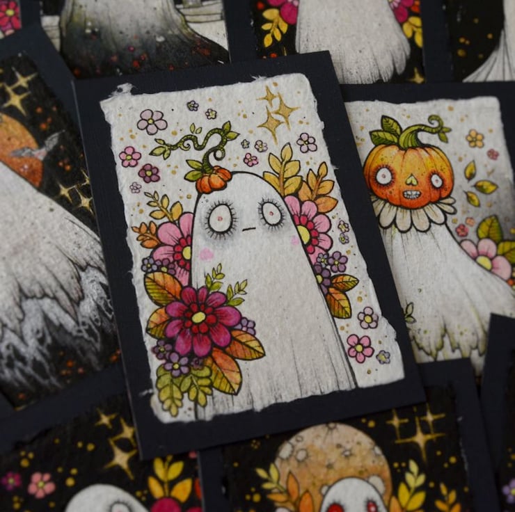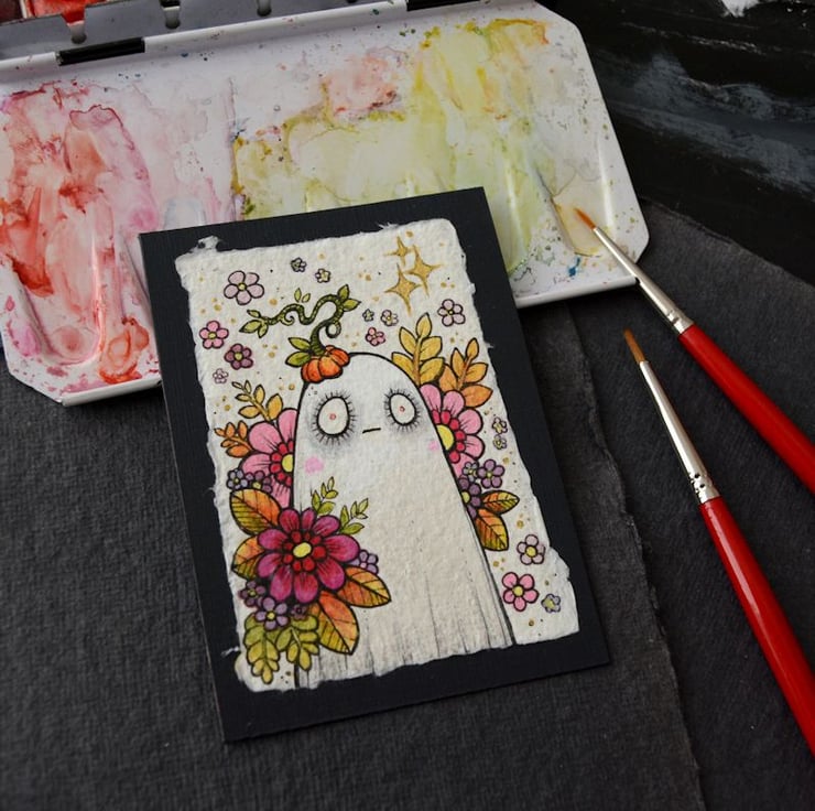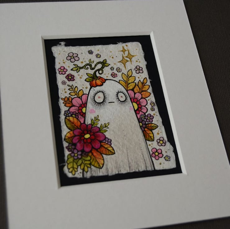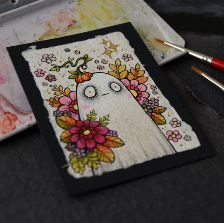 this aceo is an original artwork, hand drawn with a tiny 0.05 nibbed pen, then coloured with ink, artists pens and watercolour paints, on indian khadi paper. khadi paper is handmade from recycled cotton rag, it has a lovely textured surface and deckled edges. i have then mounted the illustration onto 300gsm cardstock, hand painted with a paynes grey to create a dark surrounding edge/background.