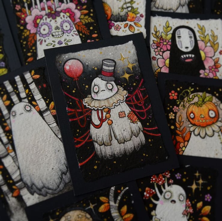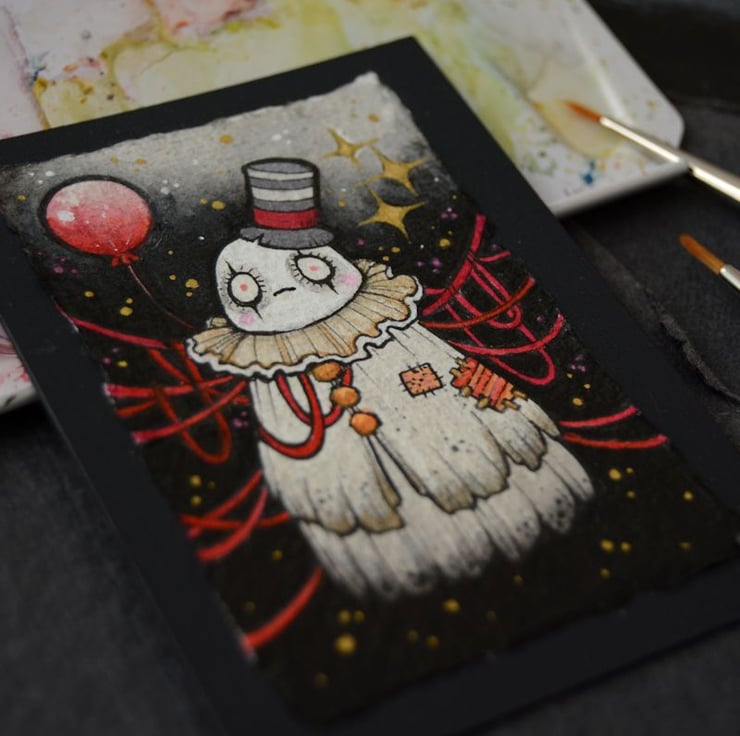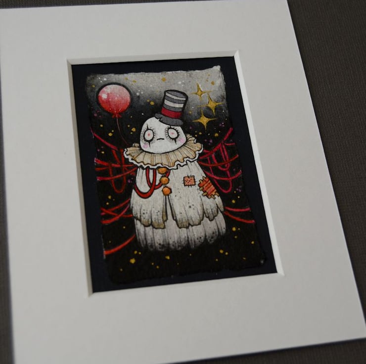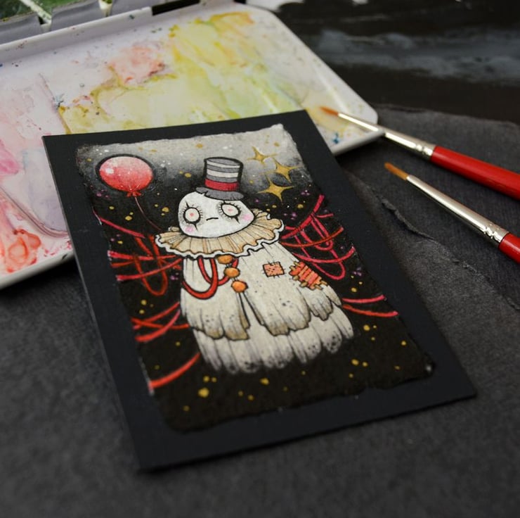 this aceo is an original artwork, hand drawn with a tiny 0.05 nibbed pen, then coloured with ink, artists pens and watercolour paints, on indian khadi paper. khadi paper is handmade from recycled cotton rag, it has a lovely textured surface and deckled edges. i have then mounted the illustration onto 300gsm cardstock, hand painted with a paynes grey to create a dark surrounding edge/background.