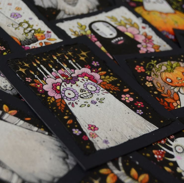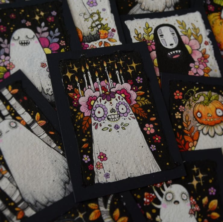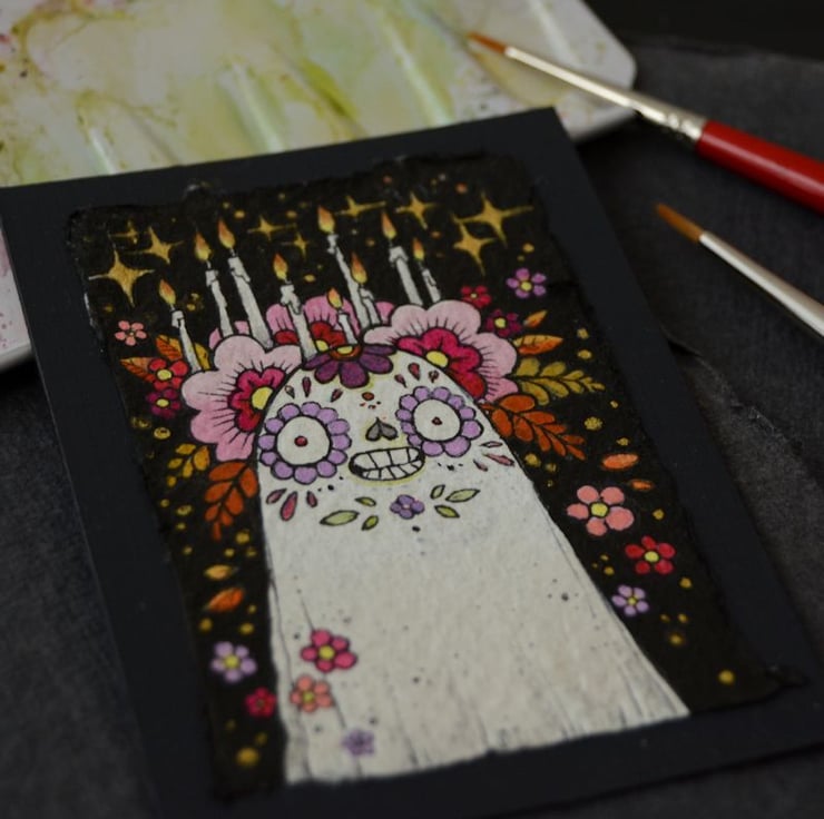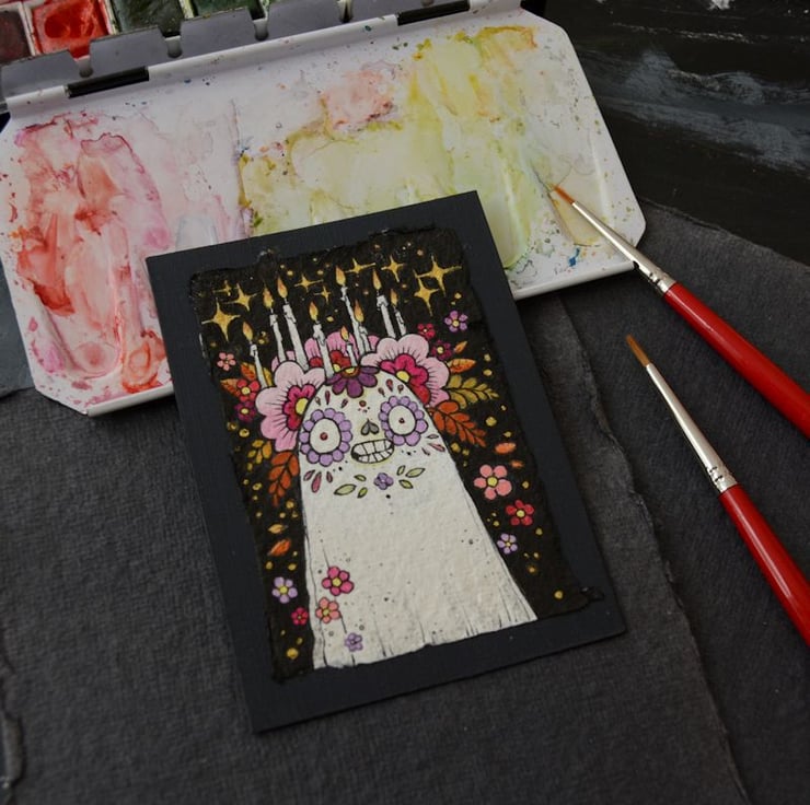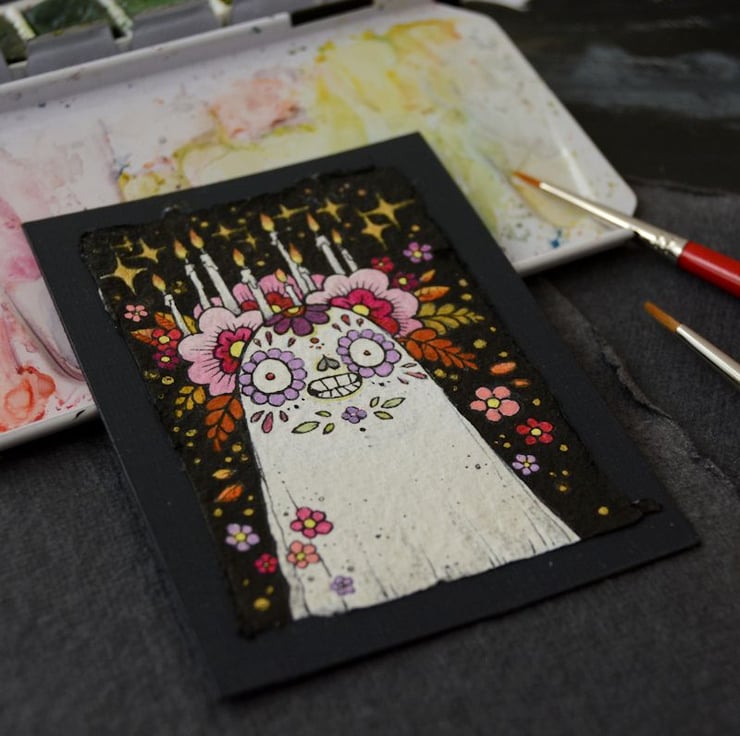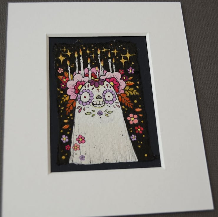 i created a ghost a day for the entire month of october! this sweet little sugarskull inspired senorita arrived on day 19, floral crown all aflame and burning brightly.
