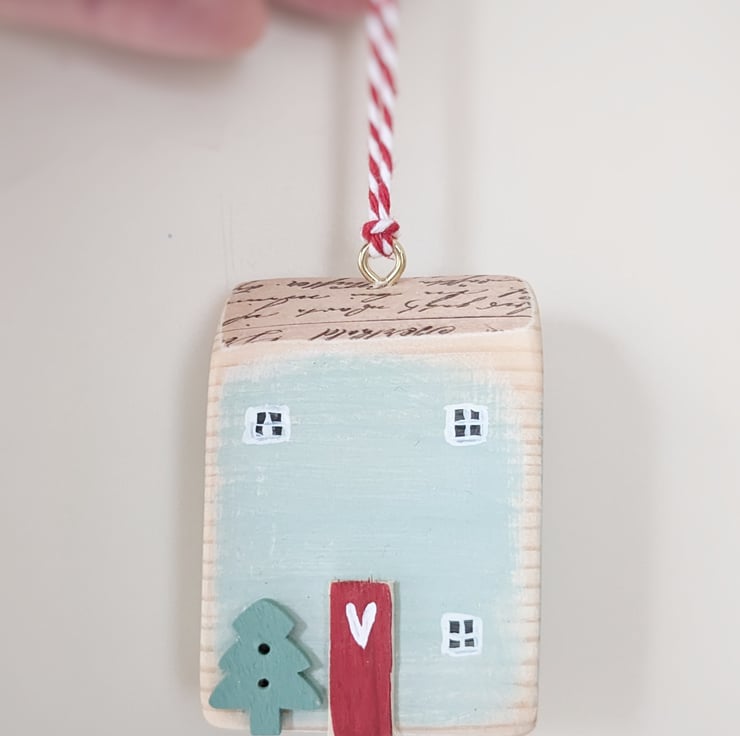 Hand painted with teeny windows and wooden front doors these one of a kind houses are ready to hang.