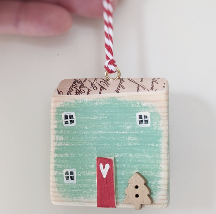 Hand painted with teeny windows and wooden front doors these one of a kind houses are ready to hang.