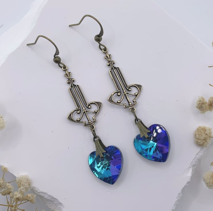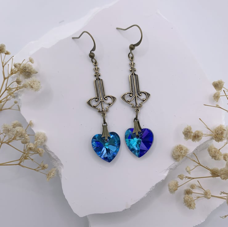 These pretty vintage style earrings are made with antique gold-plated Art Nouveau style connectors with rich blue glass crystal heart drop charms.. The earrings are finished with gold-plated bronze tone ear wires.. The finished length of the earring is 6.5cm.