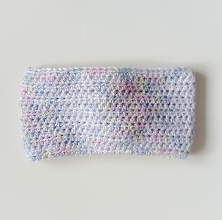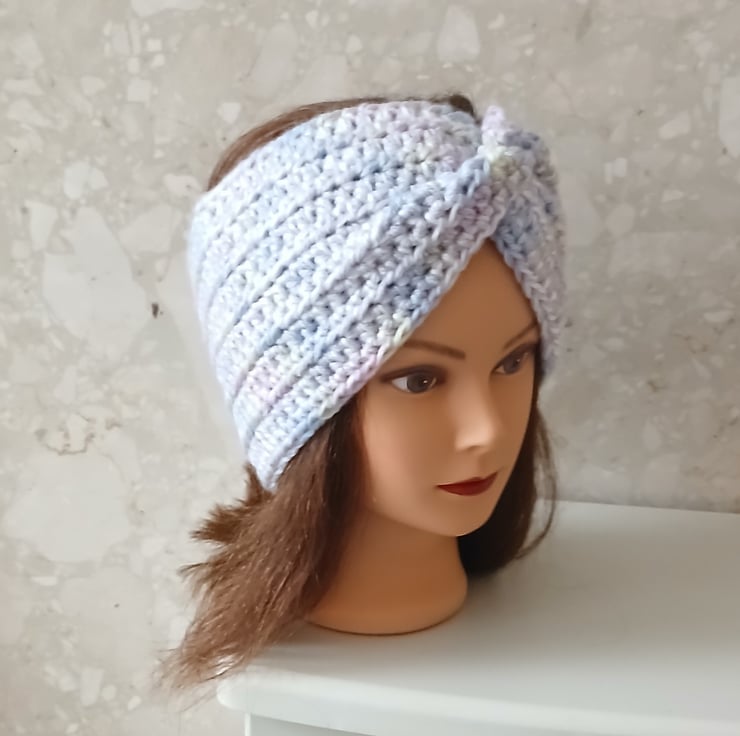 Yarn and colour: The headband is crochet using Divante Knitting Yarn and Stylecraft Special Double Knitting Yarn with the yarns held double to create a chunky yarn in shades of Pale Blue Ombre and Grey The yarn is supersoft and is 100 per cent acrylic.