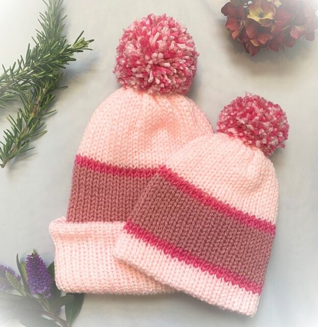 I adore seeing young children twinning with their parents / carers, so I wanted to create something practical and cosy of my own. So, using the three pink shades of yarn I had available, I set about making a matchy set just for you, with pom-poms of course!