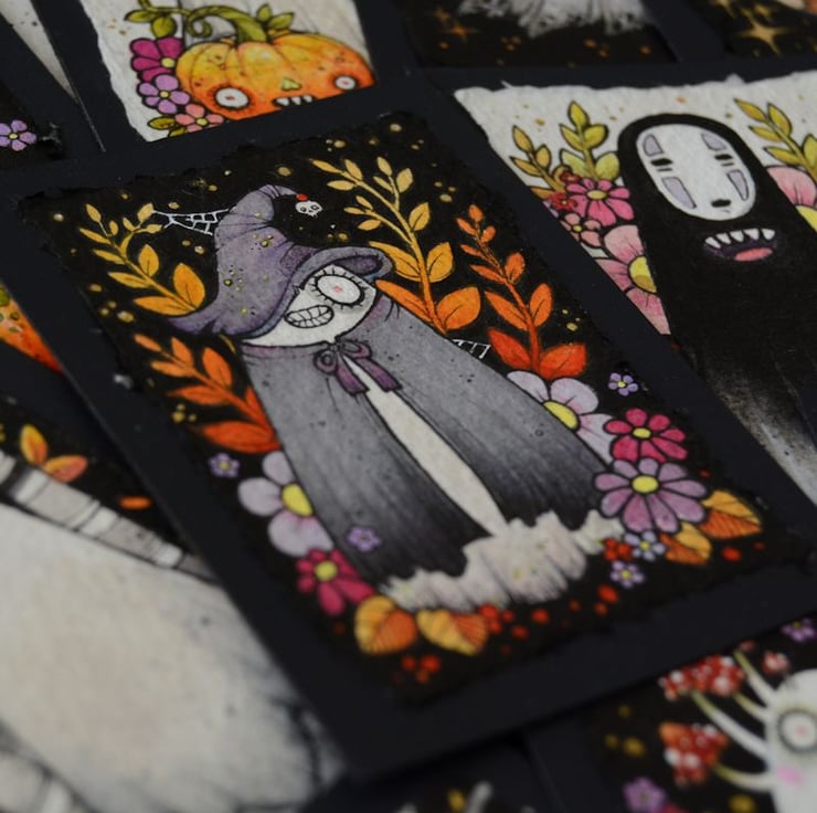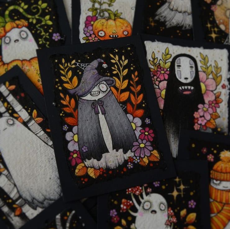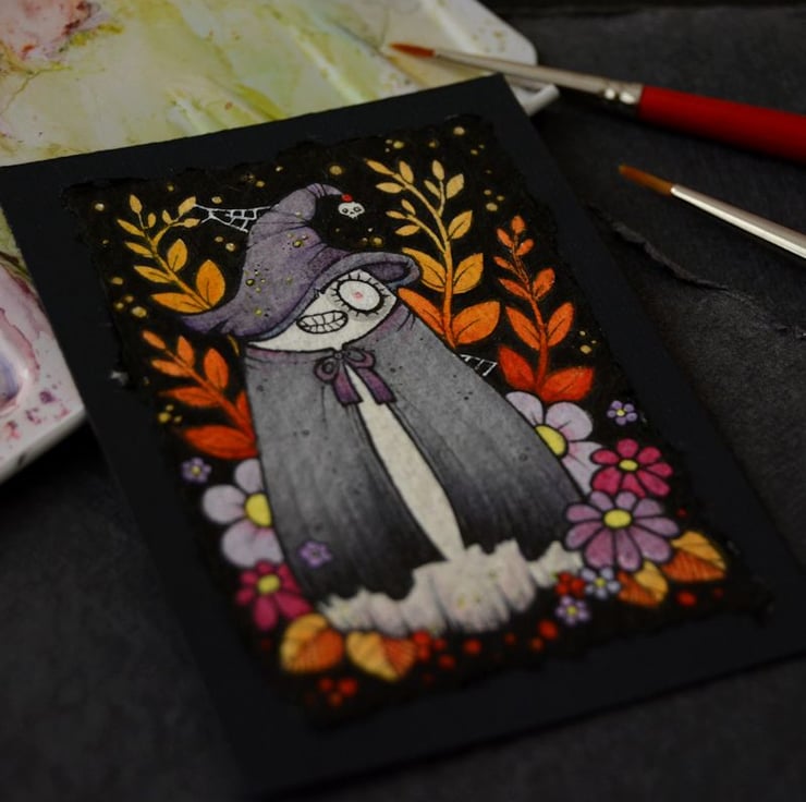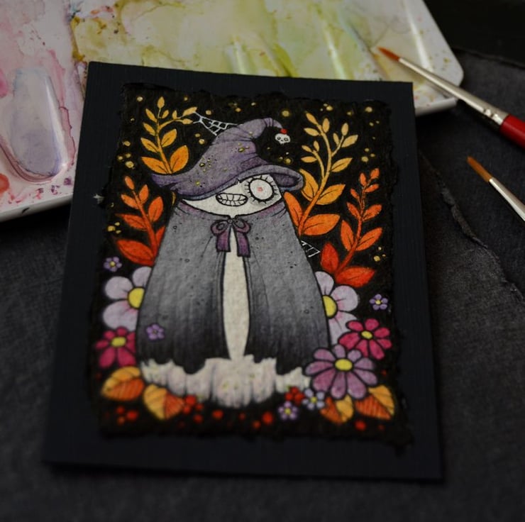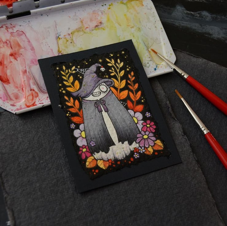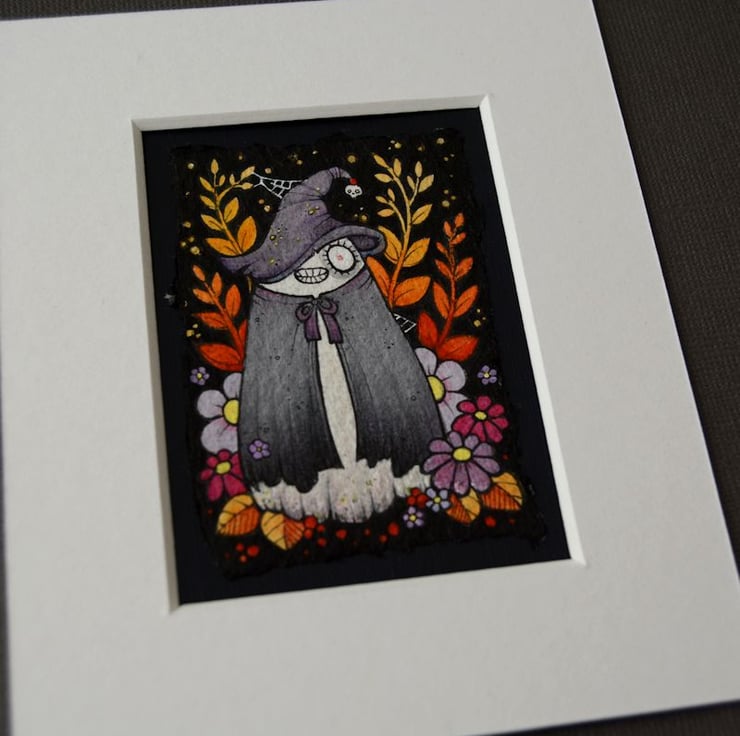 this aceo is an original artwork, hand drawn with a tiny 0.05 nibbed pen, then coloured with ink, artists pens and watercolour paints, on indian khadi paper. khadi paper is handmade from recycled cotton rag, it has a lovely textured surface and deckled edges. i have then mounted the illustration onto 300gsm cardstock, hand painted with a paynes grey to create a dark surrounding edge/background.