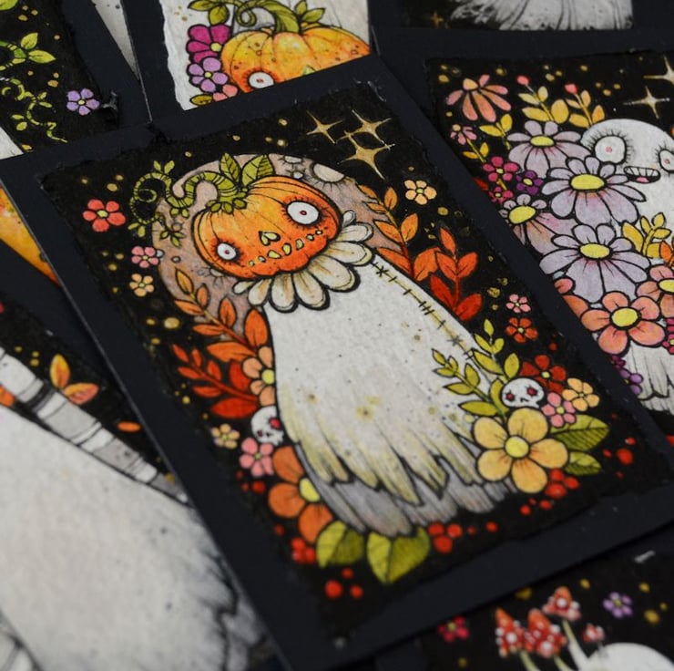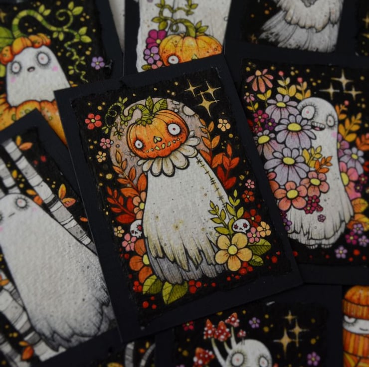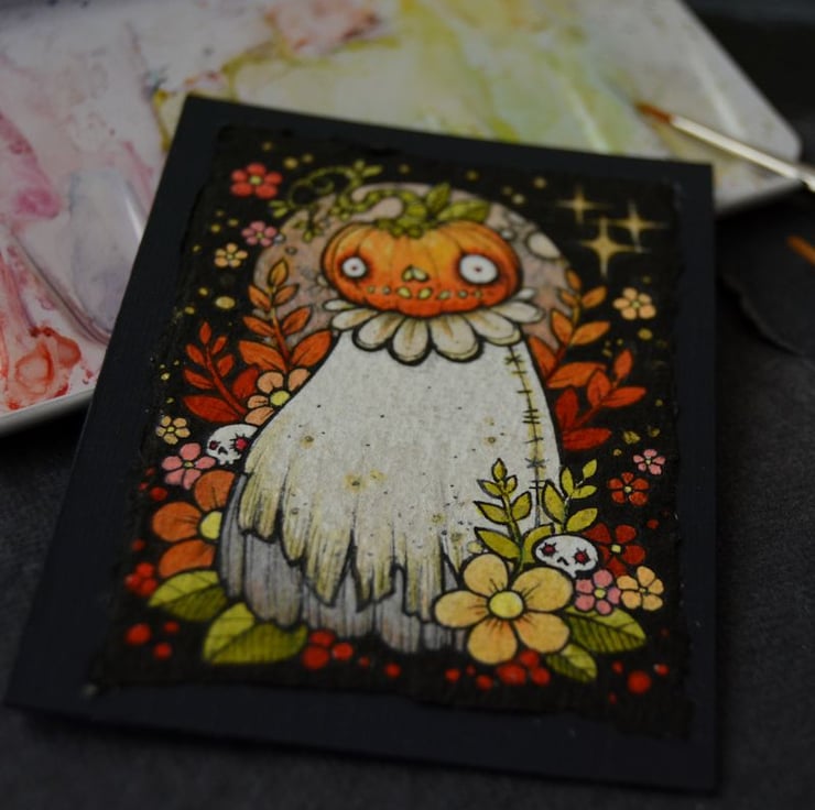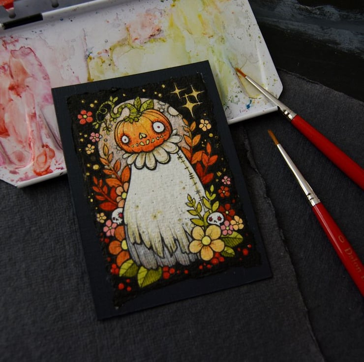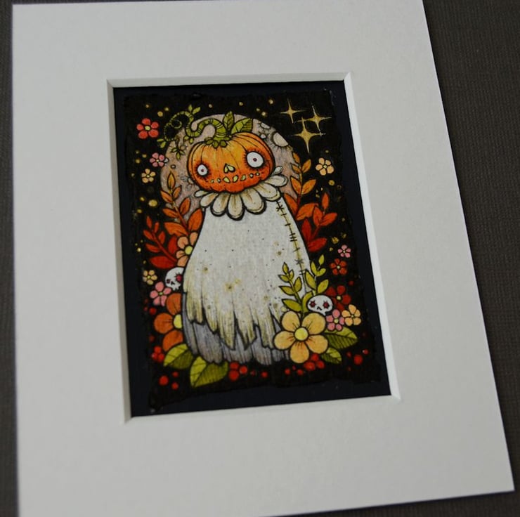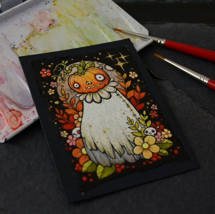 this aceo is an original artwork, hand drawn with a tiny 0.05 nibbed pen, then coloured with ink, artists pens and watercolour paints, on indian khadi paper. khadi paper is handmade from recycled cotton rag, it has a lovely textured surface and deckled edges. i have then mounted the illustration onto 300gsm cardstock, hand painted with a paynes grey to create a dark surrounding edge/background.