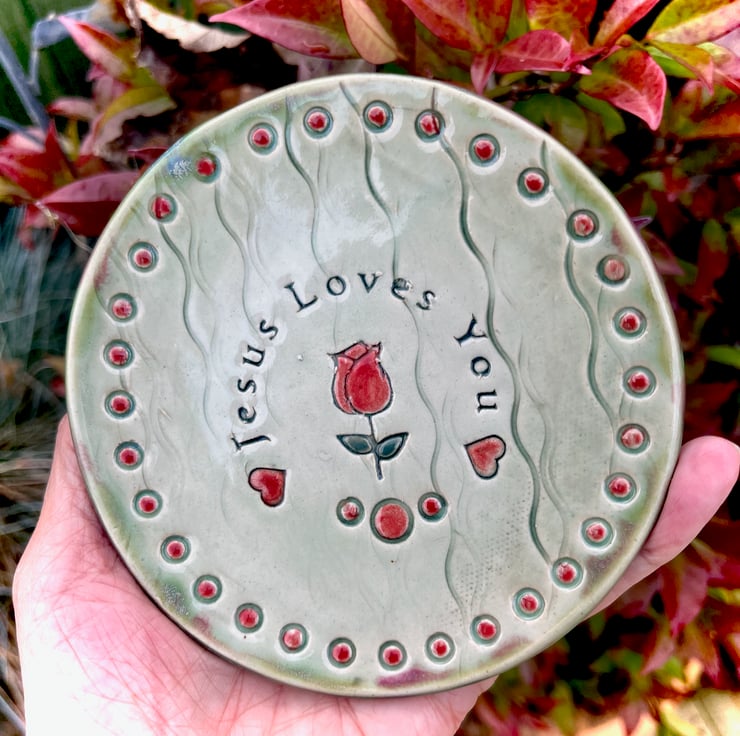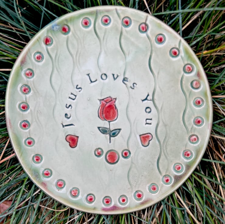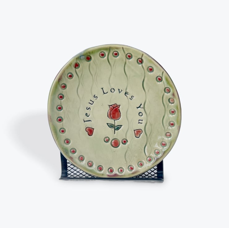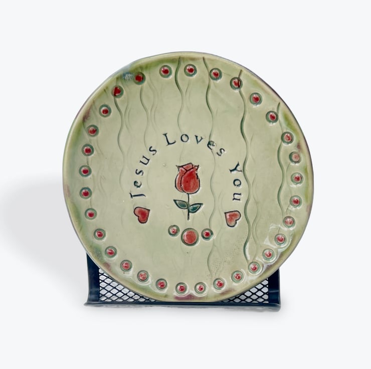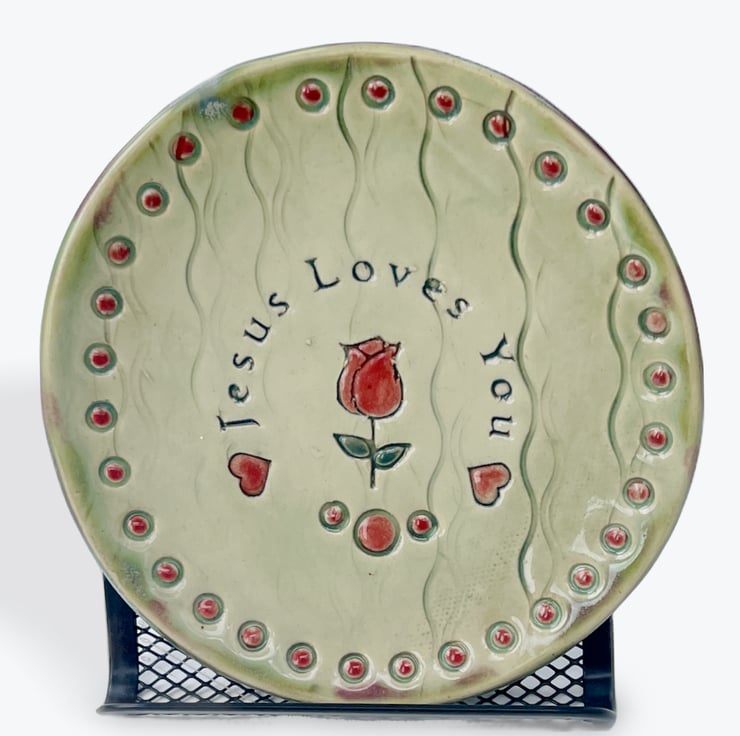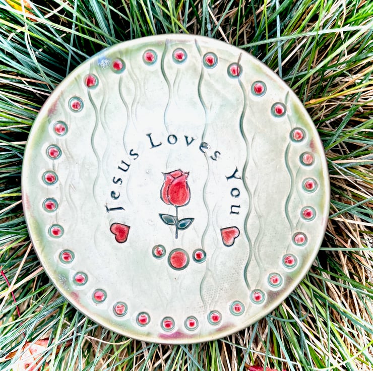 A beautifully crafted stoneware plate featuring the impressed words “Jesus Loves You.”