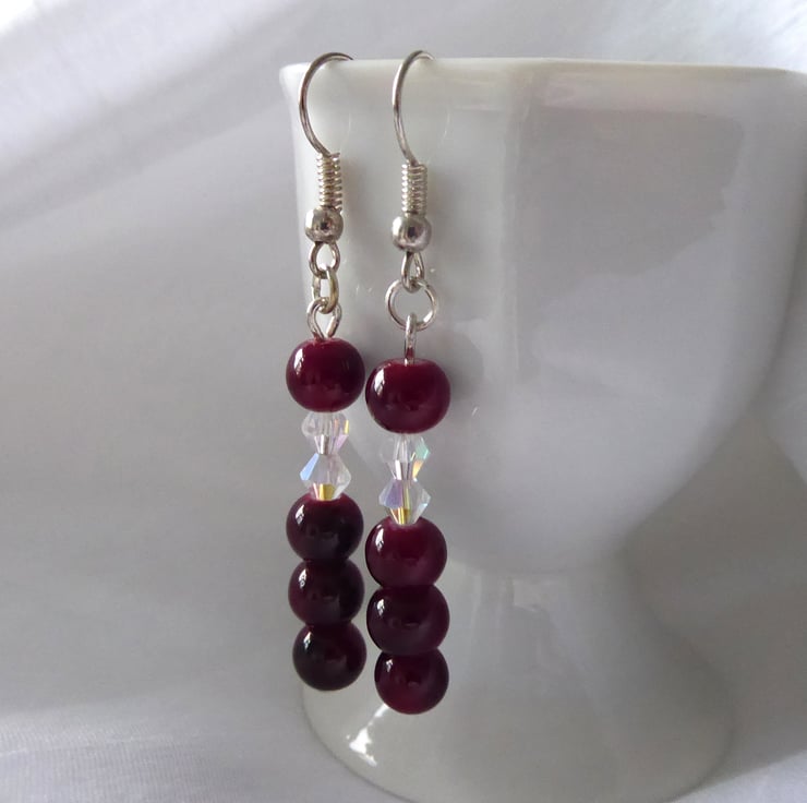 These beautiful dark red bead earrings are accented with tiny AB coated crystals which reflect light in rainbow-coloured sparkles. Perfect for a winter celebration or Christmas gift.