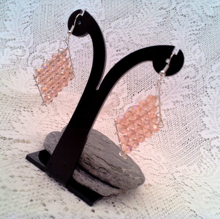 These pretty diamond shaped earrings would go well with any outfit you wear for a special occasion or for a casual evening out. They would make the perfect gift for a friend or relative for a birthday or anniversary or Christmas, as a stocking filler, Secret Santa or a treat for yourself. Each earring is made using twenty 6 mm x 4 mm crystal rondelle beads threaded equally onto 4 separate eye pins and the two other eye pins are threaded through the top and bottom loops of each of the 4 beaded eye pins . They are suspended at one of the corners of the resultant beaded square onto silver plated hook ear wires. They have a drop of approx 2 inches (5 cm) from the base of the ear hooks. There are six pairs available, this listing is for one pair only.