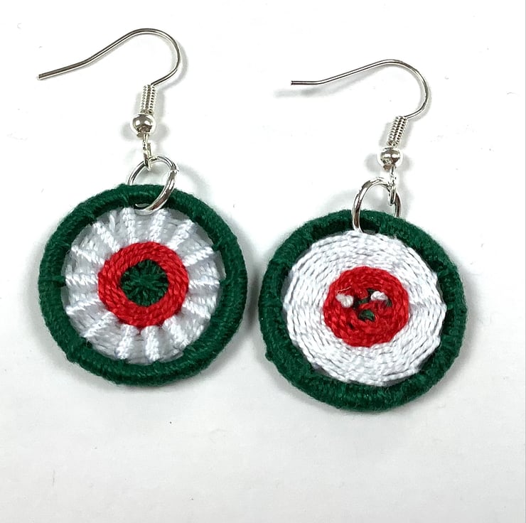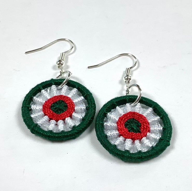 Cotton Perle thread has been wound around 2cm metal rings to make these pretty Dorset Button earrings. The rings hang from silver plated earwires.