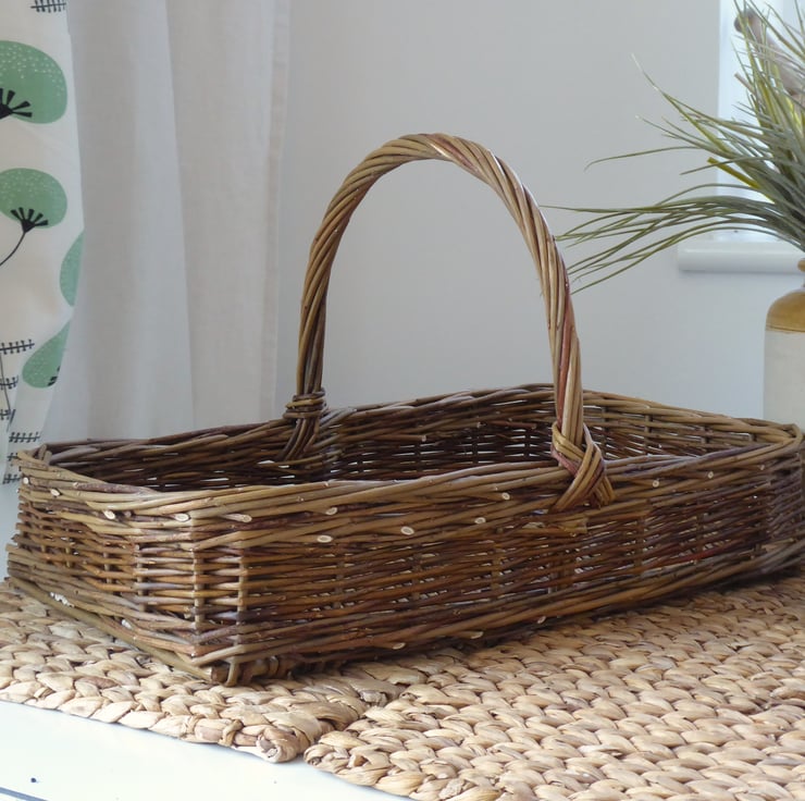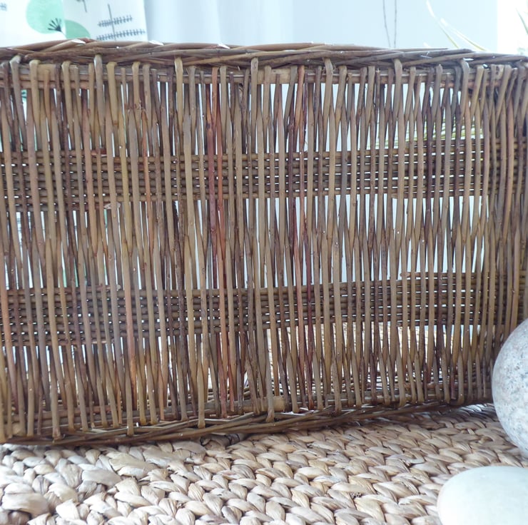 This is a rectangular shallow sided basket with a handle. Which will bring some nature into your home, and is useful too. I am really enjoying using the Catalan style frame bases It gives a uniformity to the weave and allows you to create different shapes.