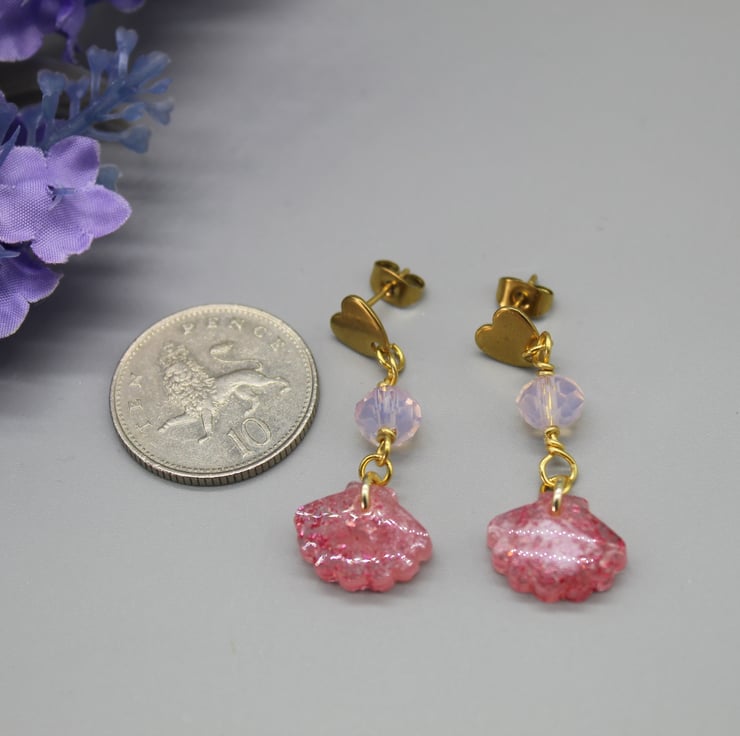 Each earring features a shimmery pink resin shell paired with a soft opalescent bead and finished with a golden heart stud — a sweet nod to love and the ocean. The gentle glitter and pearlescent hues catch the light beautifully, making them a perfect accessory for mermaid lovers and dreamers alike.