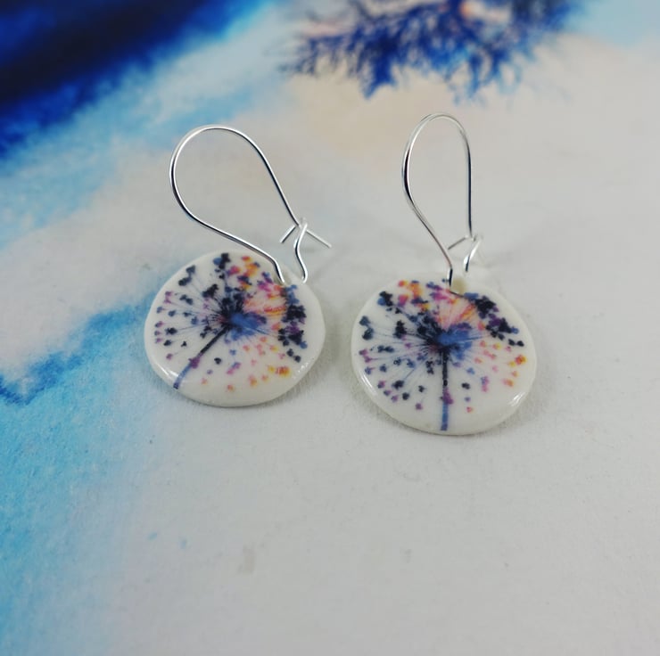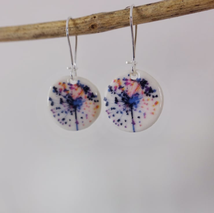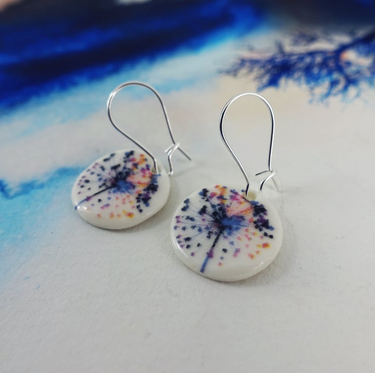 18mm porcelain ceramic clay glazed earrings with my own botanical flower design. Lightweight. Silver plated safety ear wires.
