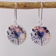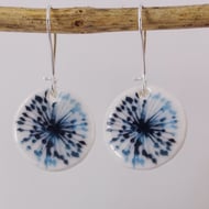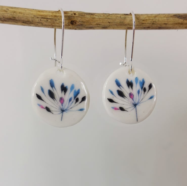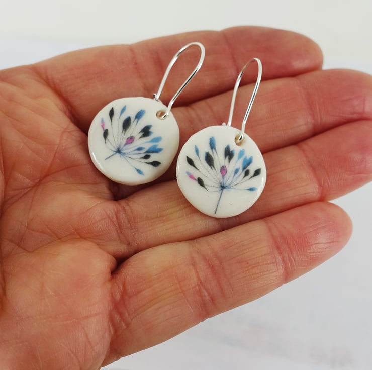 18mm porcelain ceramic clay glazed earrings with my own botanical flower design. Lightweight. Silver plated safety ear wires.