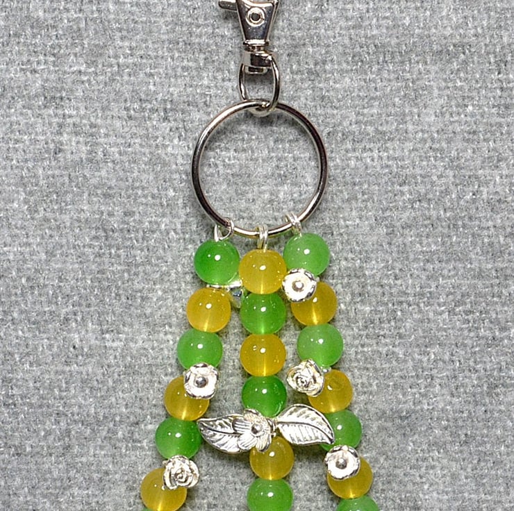 There’s a very spring-like feel to this attractive bag charm. Yellow and pale green glass beads interspersed with silver-plated flower charms makes up the three dangles, which are hung from a silver-coloured split ring and attached to a lobster clasp/lanyard clip.