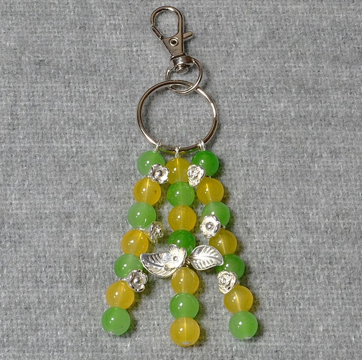Bag Charm – Yellow and Light Green Glass Bead and Silver Flower Triple Dangle