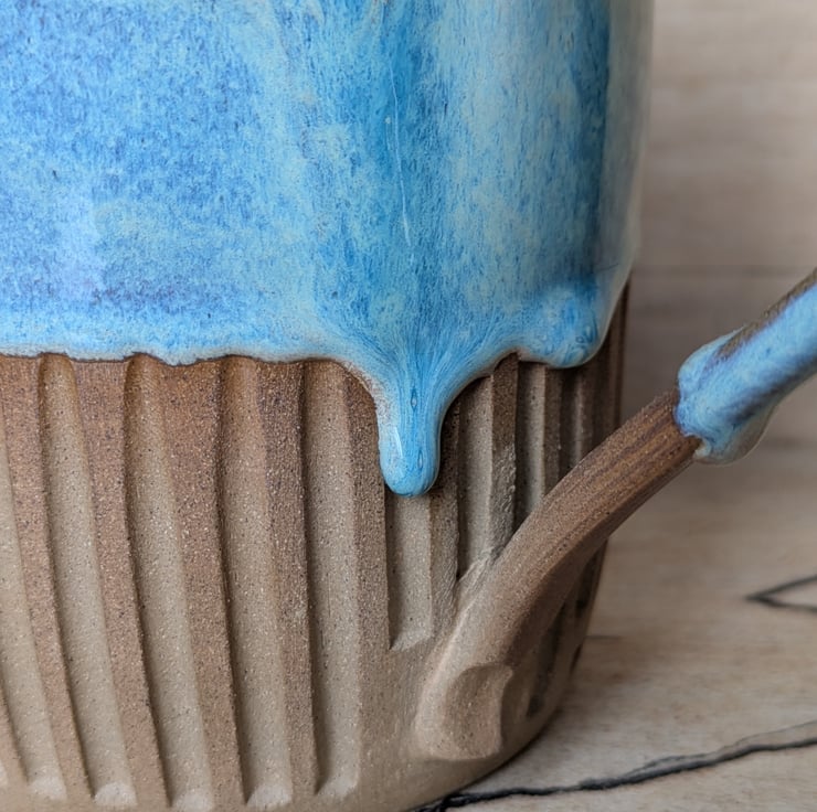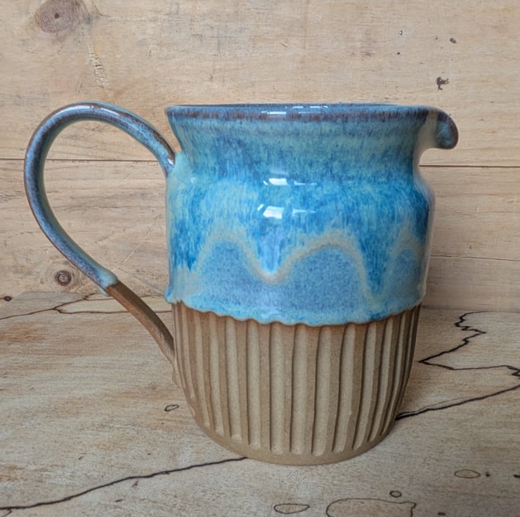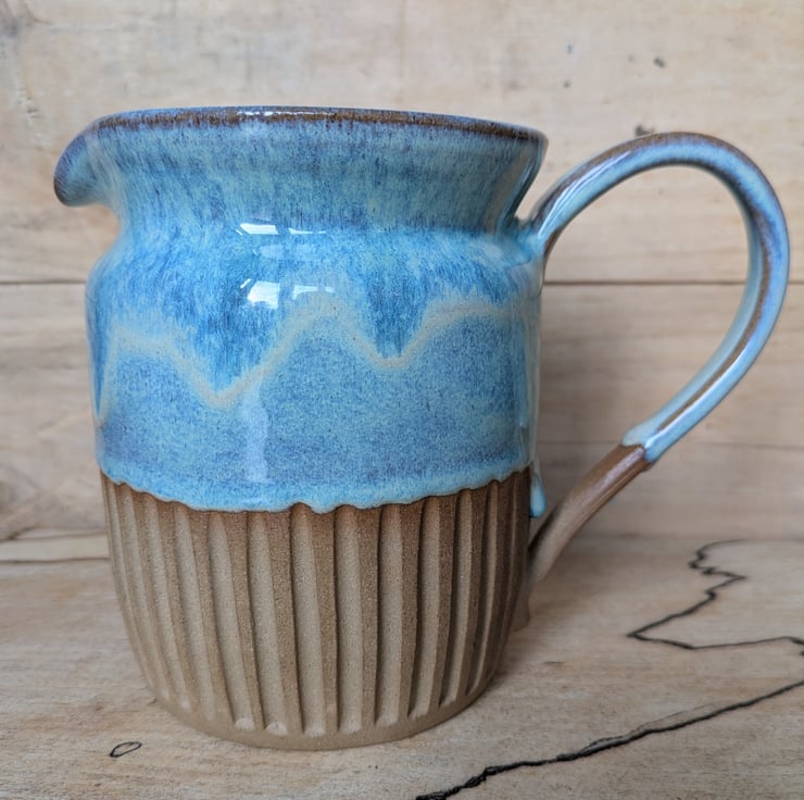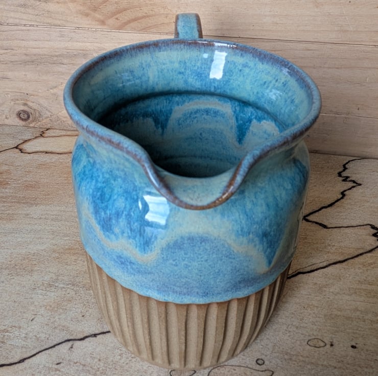 I've used a toasted clay for this jug with a shoulder which gives a delicious warm colour when fired. Love love love this glaze combination and each of them is unique as the flow of the glaze will be different every time. We have a fabby wee drip as well...another of my loves!! Have carved the bottom section and left it unglazed to show off the toasty coloured clay. This is the perfect size for milk, custard or gravy when there are several of you eating! Fired to c1200 degrees (stoneware temperature) and this makes the jugs more durable.