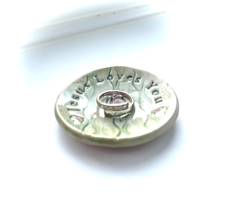 A handcrafted ceramic ring dish made from fine white stoneware clay, finished with a soft variegated green glaze on top and a delicate blush-pink glaze underneath.