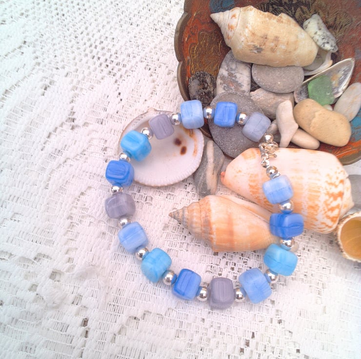 1) shades of blue and round silver beads - length 7.75 inches (19.5 cm).