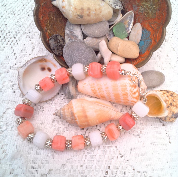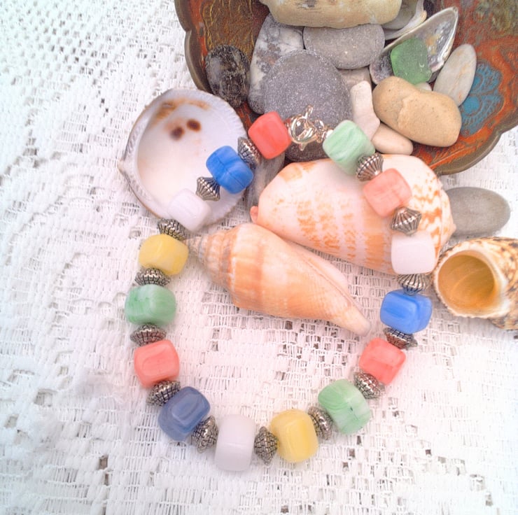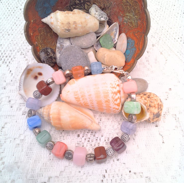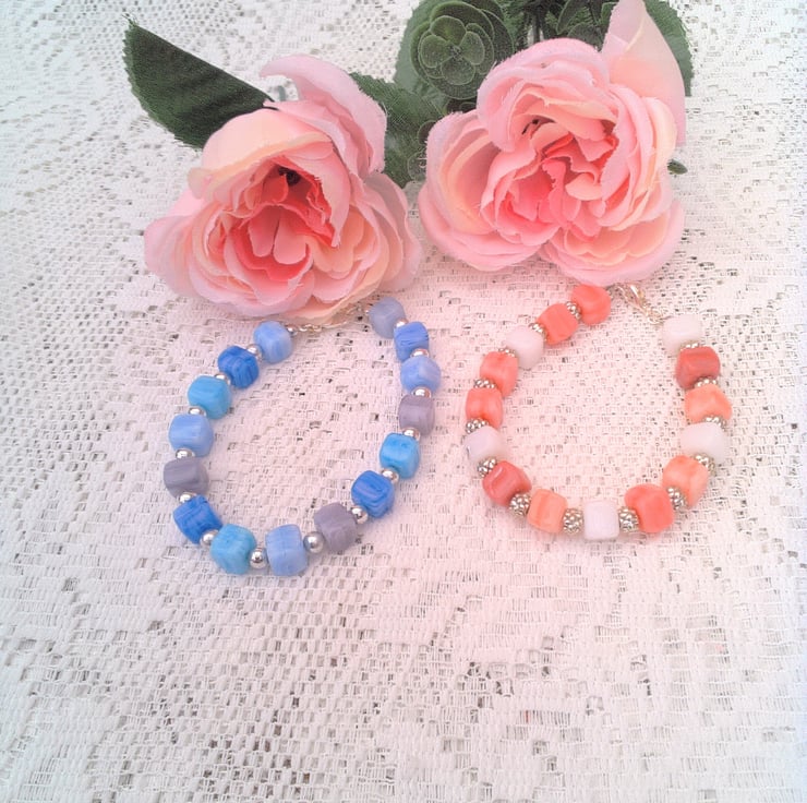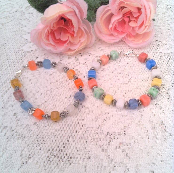 These pretty mixed colour glass cube bead and silver spacers bracelets would look great with any outfit that you wear everyday for work or for a casual party or evening out. They would also make a lovely gift for someone special for a birthday or anniversary, or as a lovely treat for yourself. The bracelets are made using multi coloured glass cube beads with various silver spacer beads. They are each fastened with a silver plated lobster clasp.