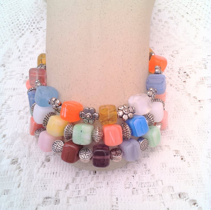 Multi Coloured Glass Cube Bead and Silver Spacer Bracelet, Christmas Gift, Gift for Her, Summer Bracelet, Glass Cube Bead Bracelet, Multi Coloured Bracelet, Birthday Gift, Anniversary Gift, 3 Strand Bracelet