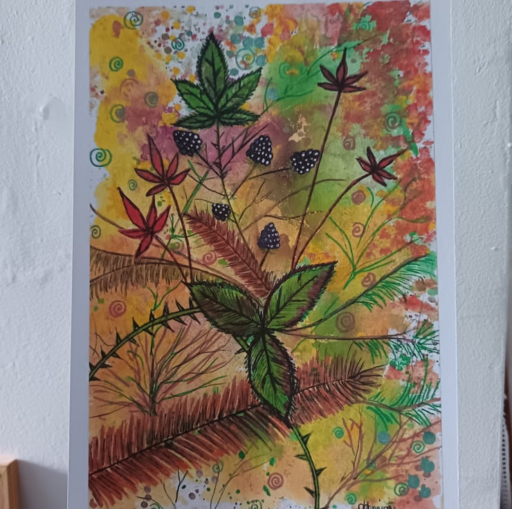 This is an A4 print of my painting Autumn Blackberries, using 300 gsm matte card. The original painting was done using mixed media - acrylics, soluble wax pastels, watercolour and various pens and markers, as I love to use a bit of everything in my art.