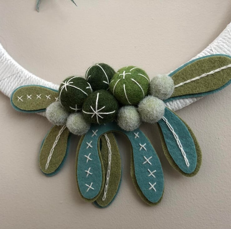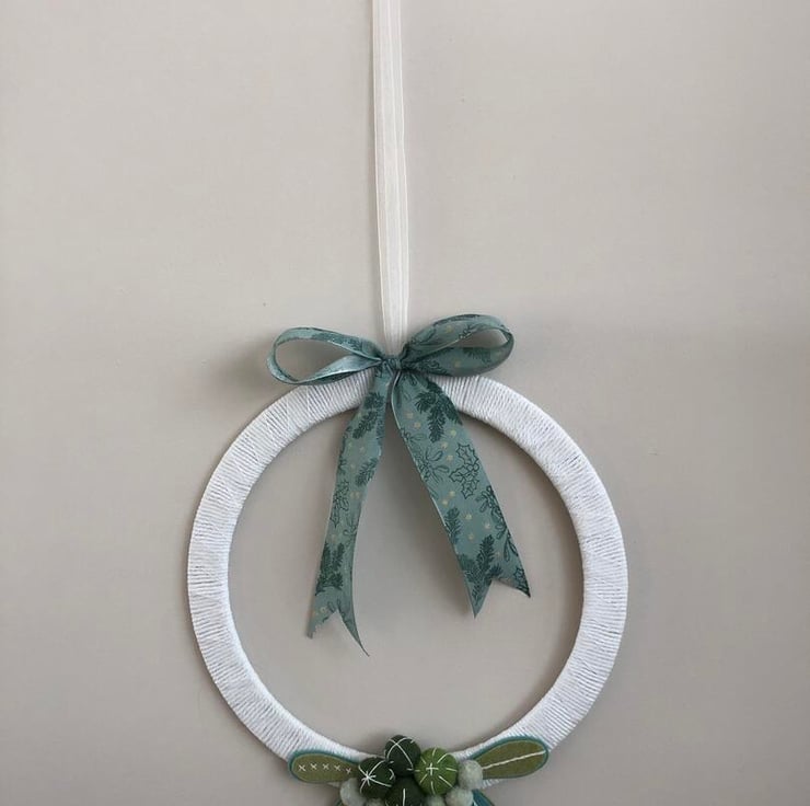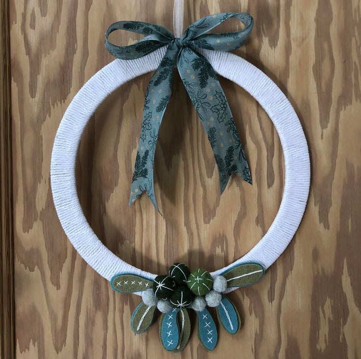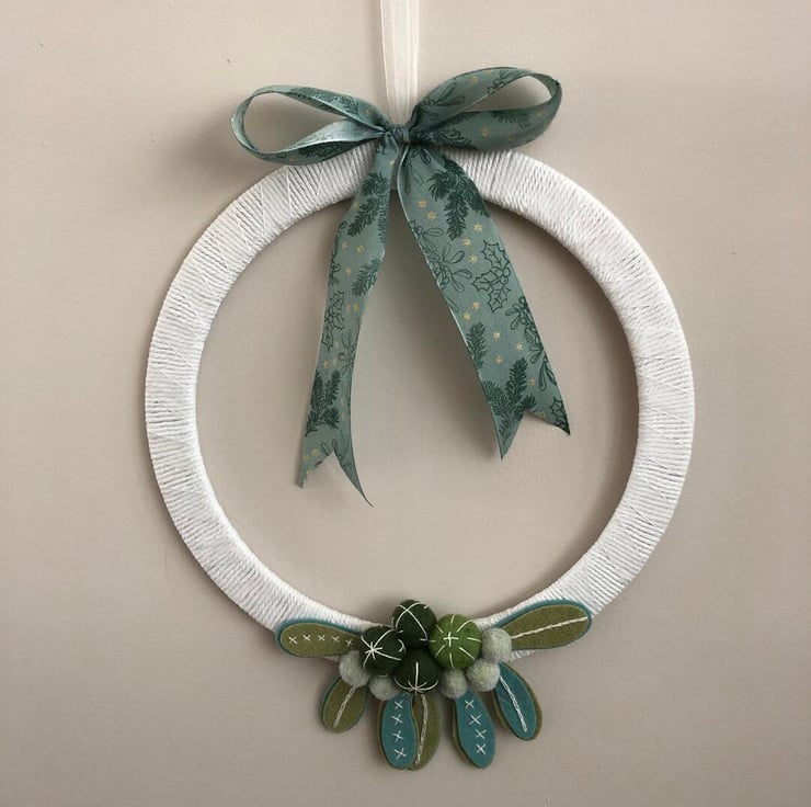 A beautiful wreath of felt mistletoe leaves and berries in non traditional Christmas colours of turquoise and green with handstitched detail. The wreath frame is a lightweight wood covered in white cord and ribbon and topped with a large Christmas bow.