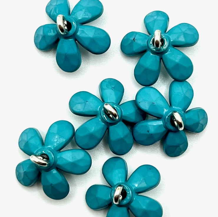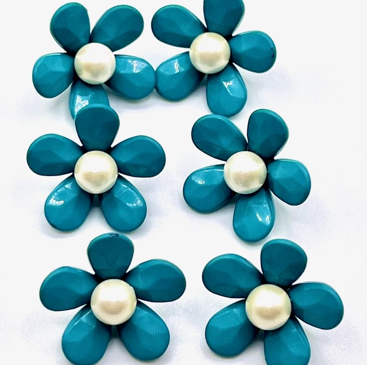 6 Textured Flower Buttons, Pearl Centre, 18mm Wide, Teal Colour, Italian Design