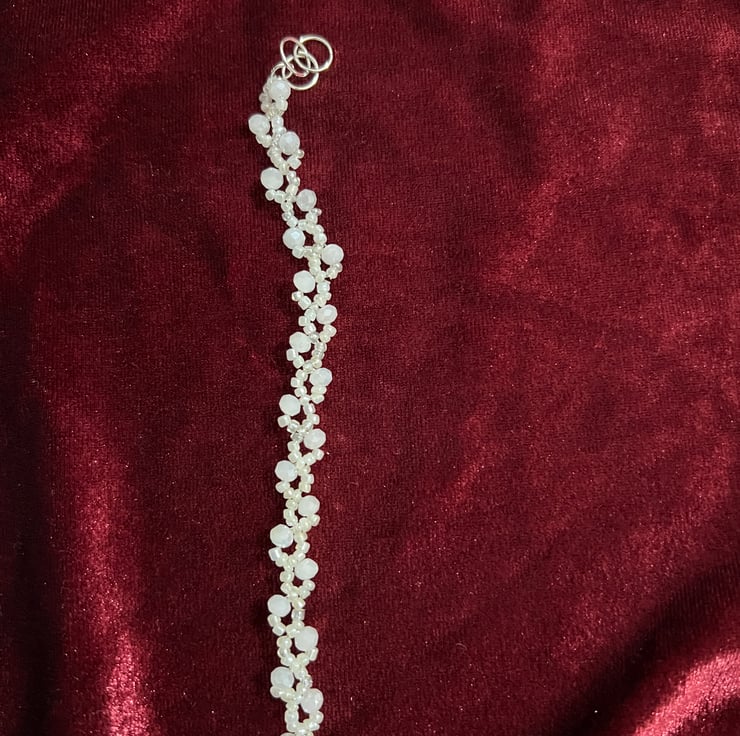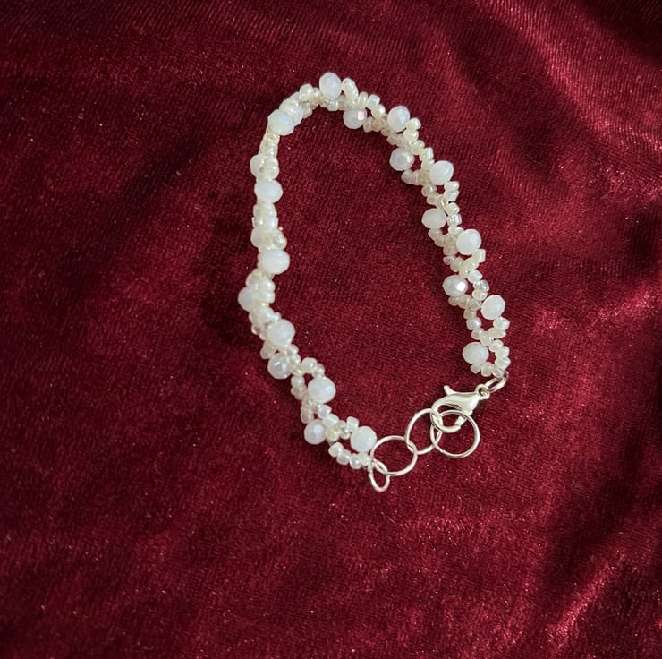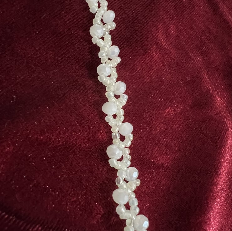 This unique piece is made of 4mm white iridescent crystal bead which are separated by 1mm white translucent glass beads .