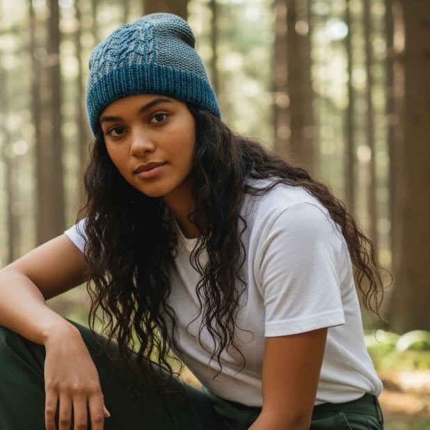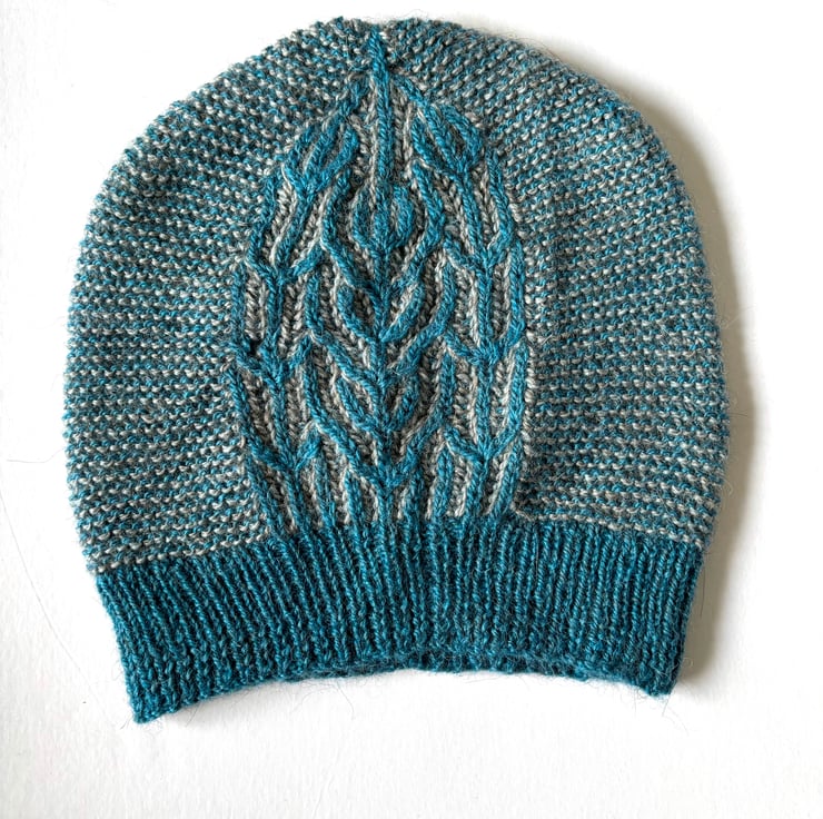 Wonderful slouchy hat in moody blues and grey worked in wool-alpaca blend yarn.